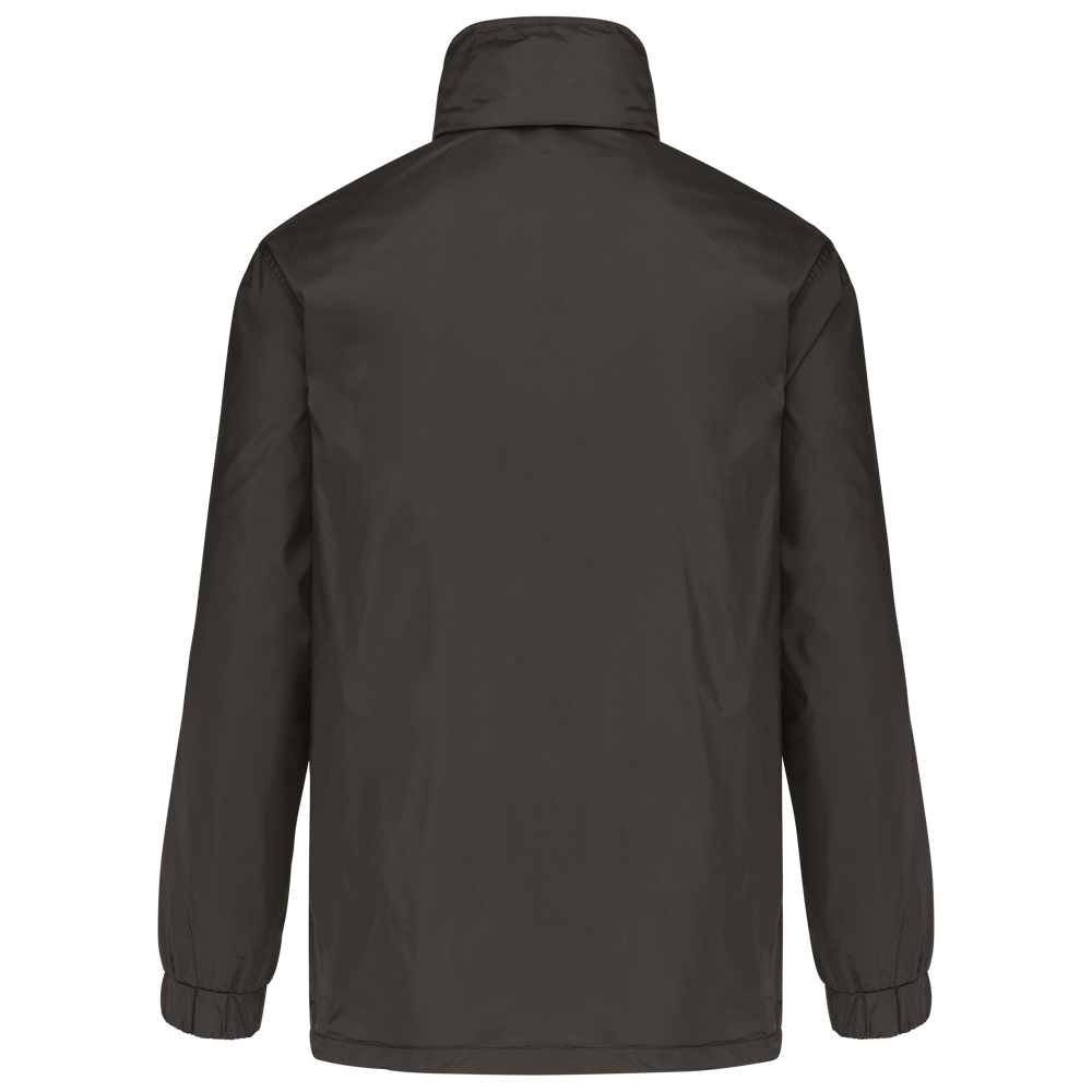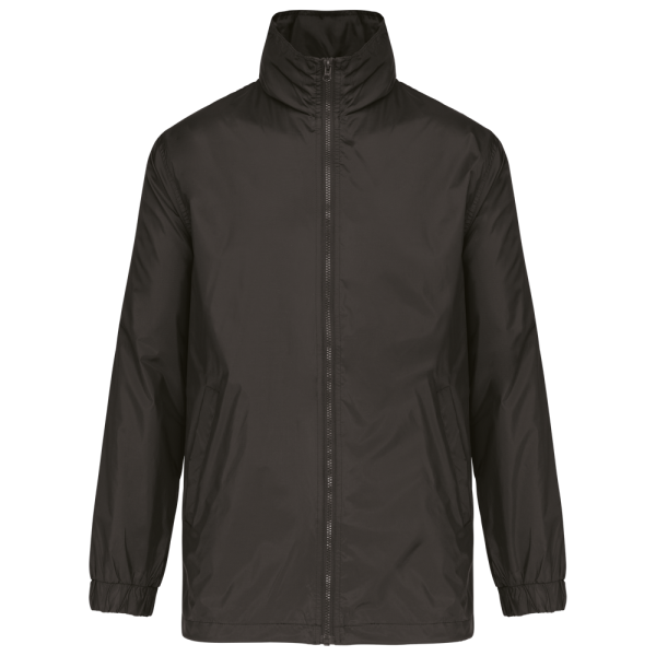100% polyamide 210 T met acryl inductie. Grijze binnenvoering van 100% polyester single jersey. Ritssluiting. 1 binnenzak en 2 buitenzakken. Aanrijgkoord met stoppers onderaan. Capuchon in de kraag met elastisch koord. Drukkersrits.