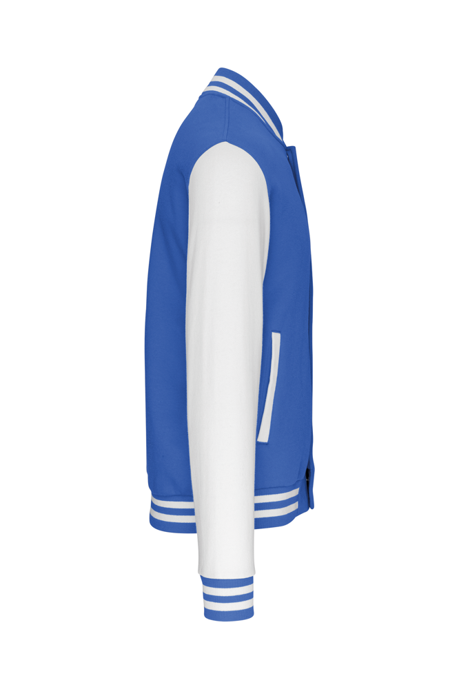 70% katoen / 30% polyester. Geborsteld fleece 3 draden. Contrasterende ingezette mouwen. Sluiting aan de voorkant met contrasterende drukknopen. Ribboord met 2 contrasterende biesjes aan kraag, mouwen en onderkant. 2 contrasterende omzoomde zakken aan de voorkant. Nektape met visgraatmotief en ophanglus in de kraag. Geen merklabel in de kraag, maar enkel een maatlabel voor eenvoudige personalisatie. De legendarische college jacket gaat al vele jaren mee. Hij is alomtegenwoordig: van de straat tot de schoolbanken