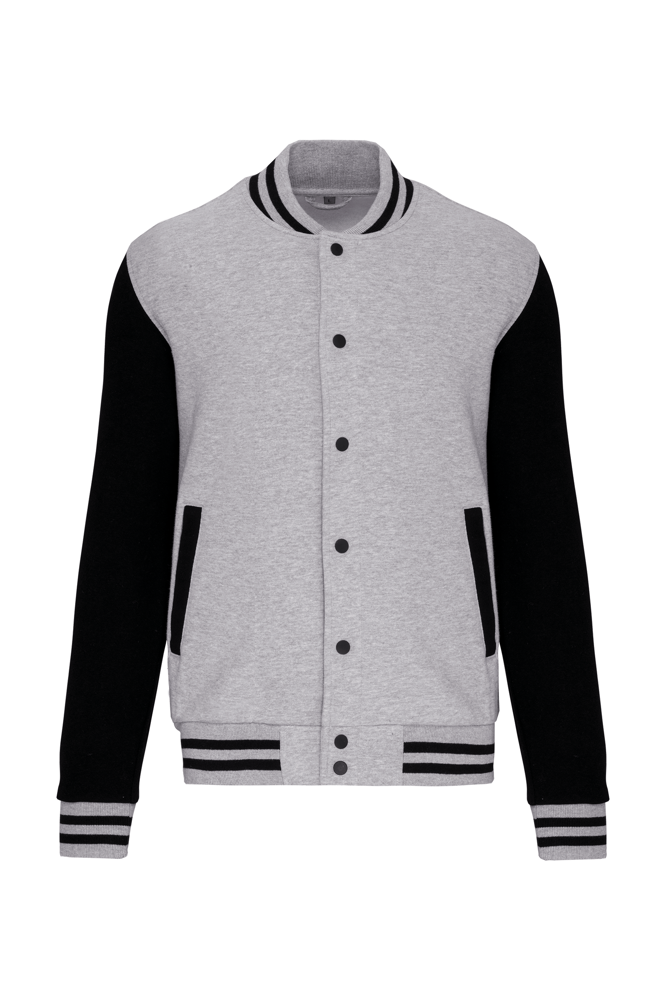 70% katoen / 30% polyester. Geborsteld fleece 3 draden. Contrasterende ingezette mouwen. Sluit aan de voorkant met drukknopen. Ribboord met 2 contrasterende biesjes aan kraag, mouwen en onderkant. 2 omzoomde zakken aan de voorkant. Nektape met visgraatmotief en ophanglus in de kraag. Geen merklabel in de kraag, maar enkel een maatlabel voor eenvoudige personalisatie. Dit mode-icoon is alomtegenwoordig: van de straat tot de schoolbanken en zelfs het podium.