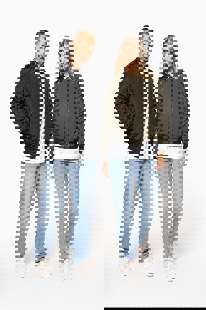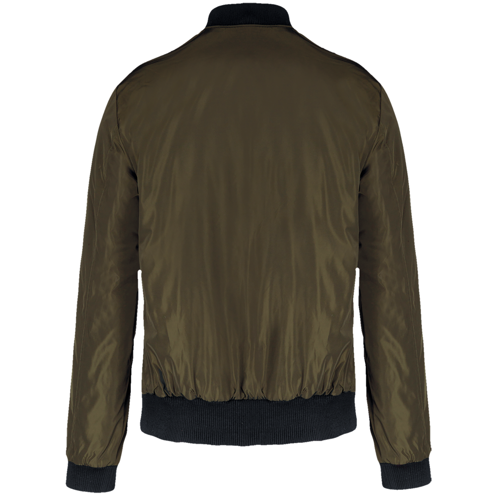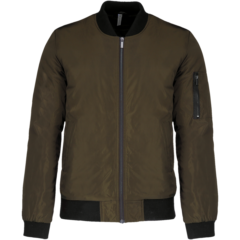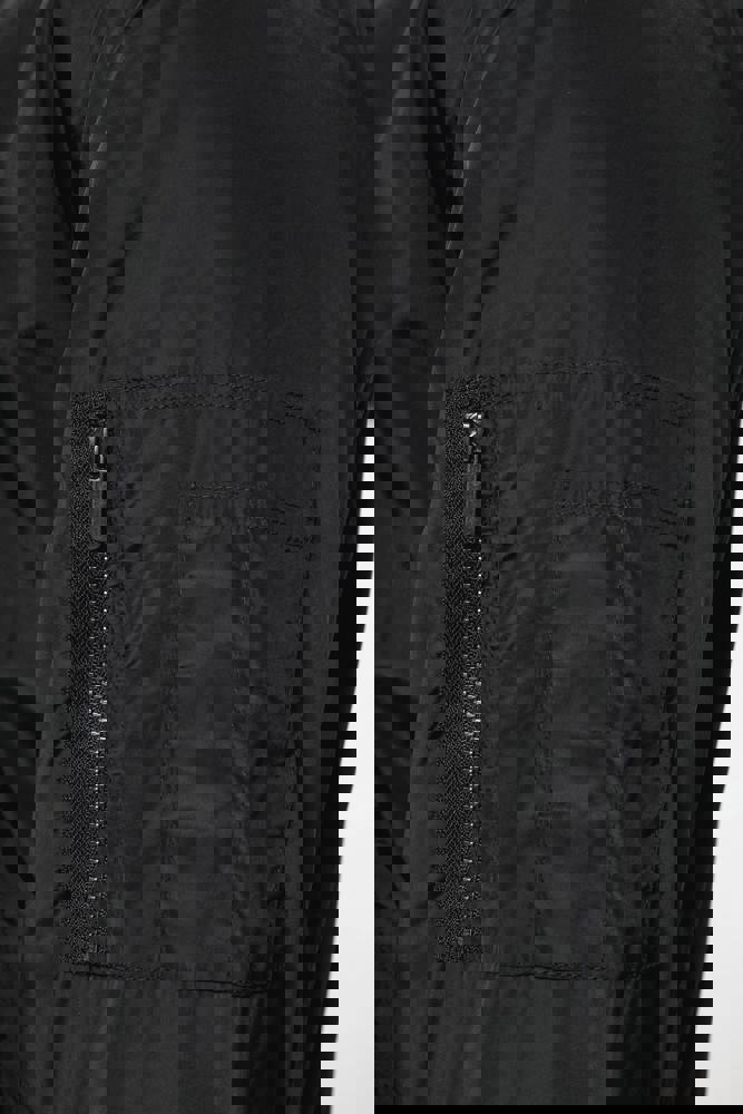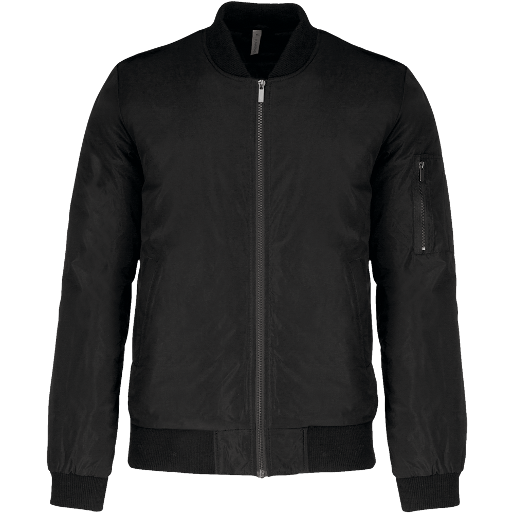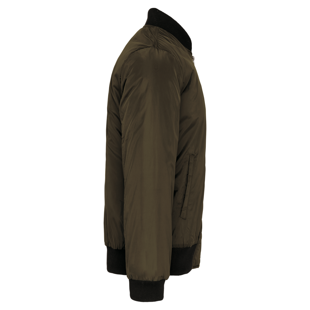 100% polyester. Gewatteerde voering van 100% polyester. Ritssluiting. 2 omzoomde zakken aan de voorkant. Opzetzak met rits en penzak op de linkermouw. Omzoomde binnenzak. 2x2 ribboord aan halsopening, mouwuiteinden en onderkant. 1 rits aan de linkerkant en 1 drukkersrits.