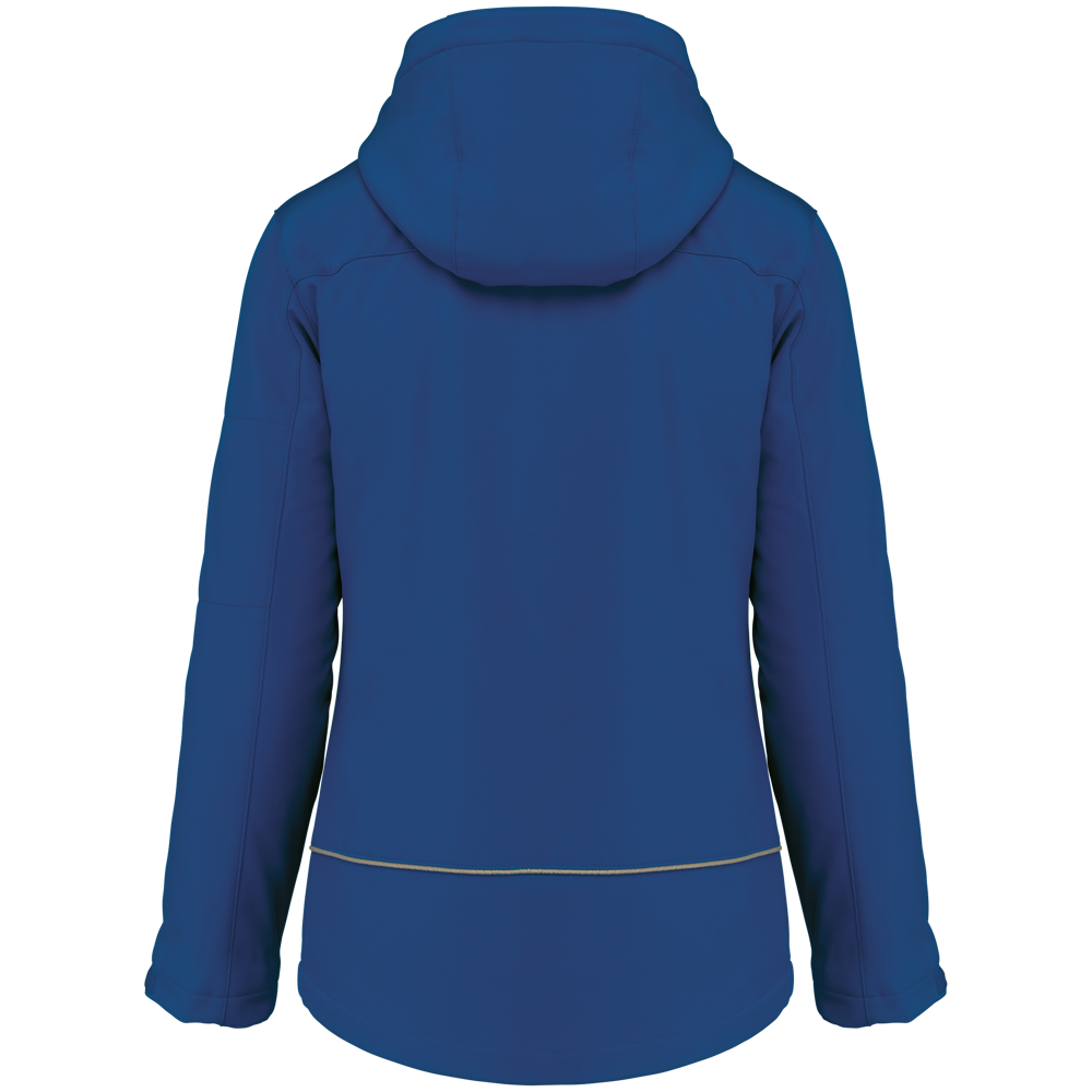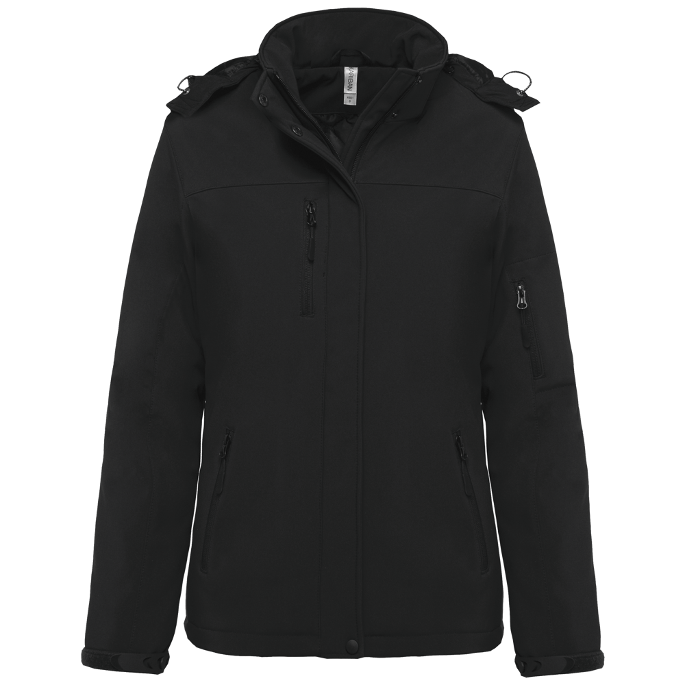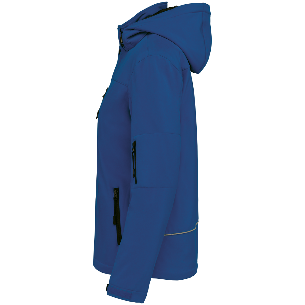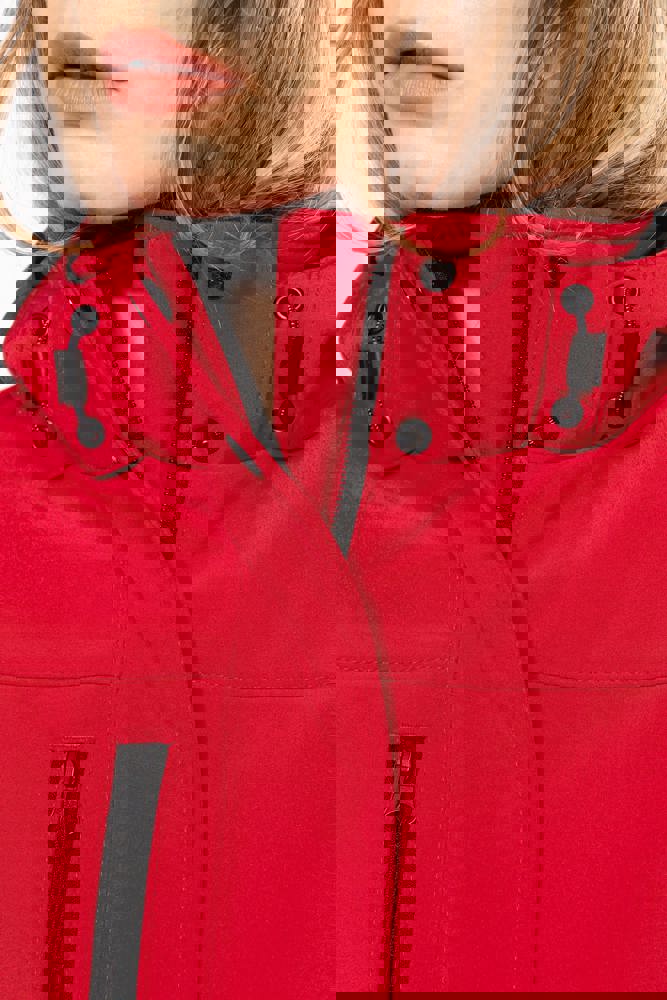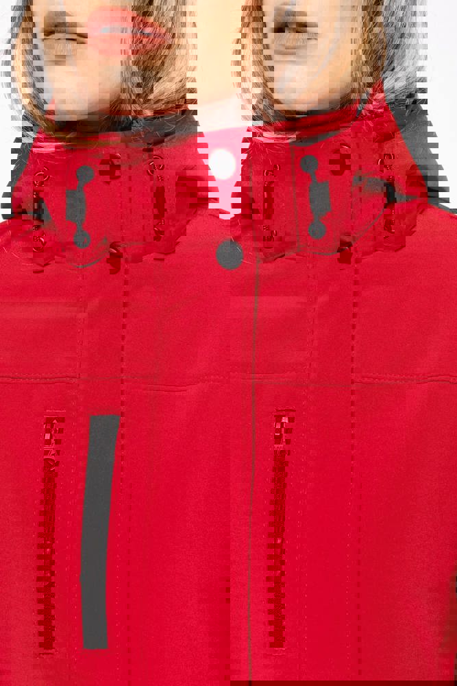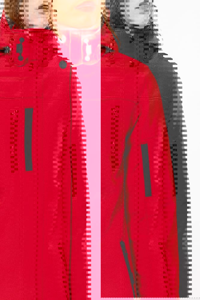 95% polyester / 5% elasthan. 3-laagse ademende stof 3000 g/m²/24 u en waterdicht 8000 mm. Buitenkant: 95% polyester / 5% elasthan. Tussenlaag: ademend membraan. Binnenlaag: microfleece. Gewatteerde voering van 100% polyester. Voorkant: 4 ritszakken (2 aan de zijkant, 1 op de mouw, 1 rechts op de borst). 2 binnenzakken met drukknoop. Afneembare capuchon met 3 gevoerde en gewatteerde panelen, regelbaar met stoppers. Met klittenband regelbare mouwuiteinden. 1 rits aan de linkerkant en 1 drukkersrits.