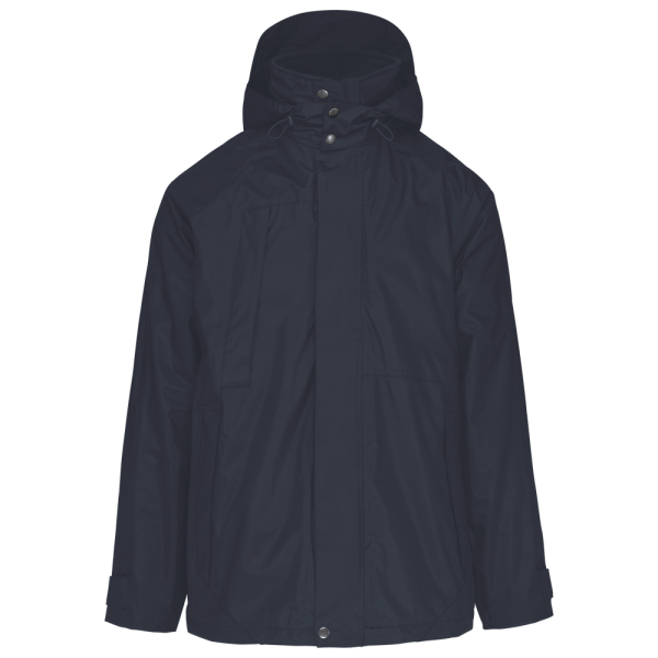 100% polyester met PVC coating. Waterdichte naden. PARKA 3-IN-1: Binnenkant: 100% netvoering van polyester en mouwen gevoerd met 100% polyester. Ritssluiting verborgen onder een lijst met drukknopen. Binnenkant van de kraag in fleecevoering. 3 zakken met rits en overslag. Regelbare mouwuiteinden met klittenbandsluiting. Afneembare capuchon met netvoering en sluiting door middel van drukknopen en stoppers. Drukkersrits. Fleecevest: 100% polyester microfleece. Mouwen gevoerd met 100% polyester om het vest eenvoudig uit en aan te trekken. Ritssluiting. 2 zijzakken. Uitneembaar fleecejack aan parka bevestigd met rits.