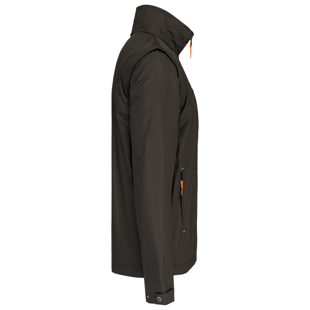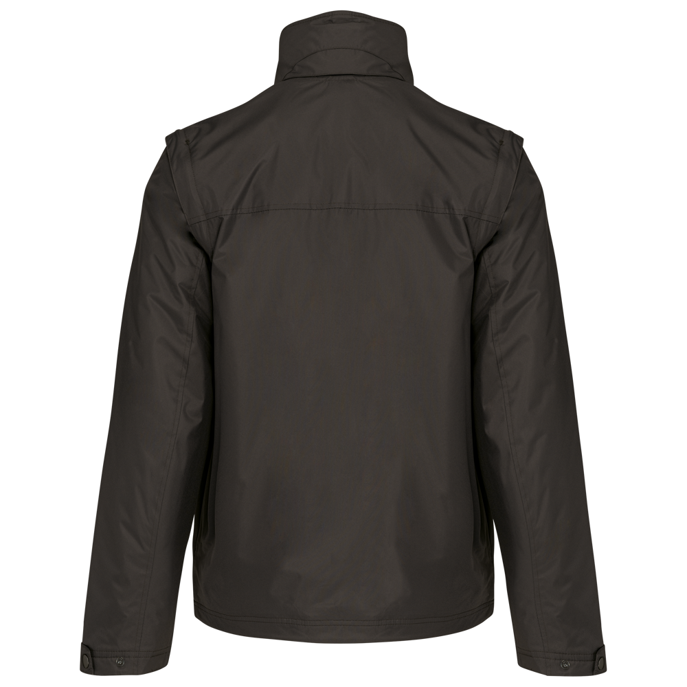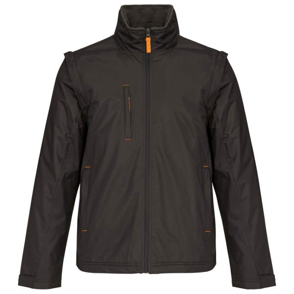 100% polyester met PVC inductie. 100% polyester fleecevoering. De voering van de mouwen is in 100% polyester + 100% polyesterwatten. Zachte stof. Volledige ritssluiting. 3 zakken met ritssluiting. Afritsbare mouwen. Verstelbare mouwuiteinden. Contrasterende ritstrekker, nektape en stopstiksels. 3 binnenzakken (2 met rits en 1 gsmzakje). Aanrijgkoord aan de binnenkant de jas. Capuchon verwerkt in de kraag. Drukkersrits.