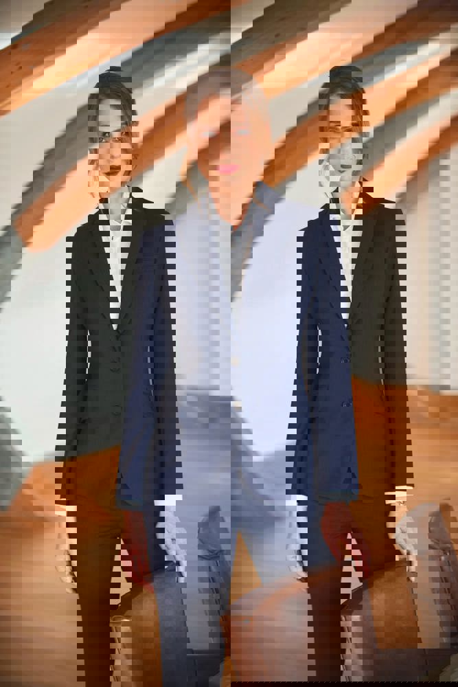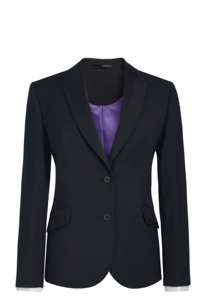 Damesblazer met 2 knopen. Getailleerde snit. Revers met decoratieve stiksels. Split aan de achterkant. 1 binnenzak. 1 borstzak.