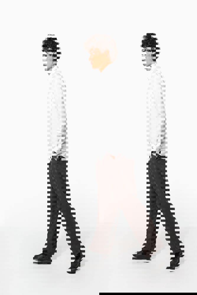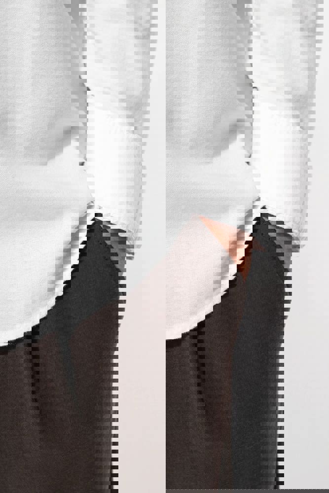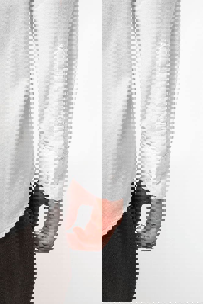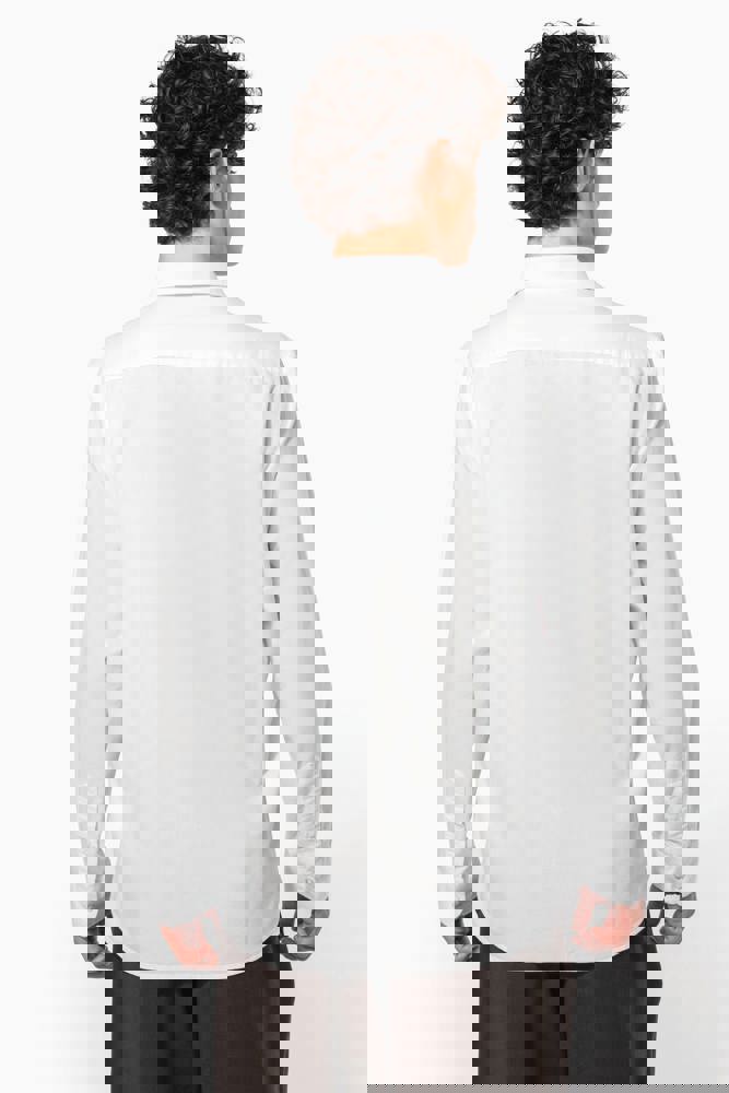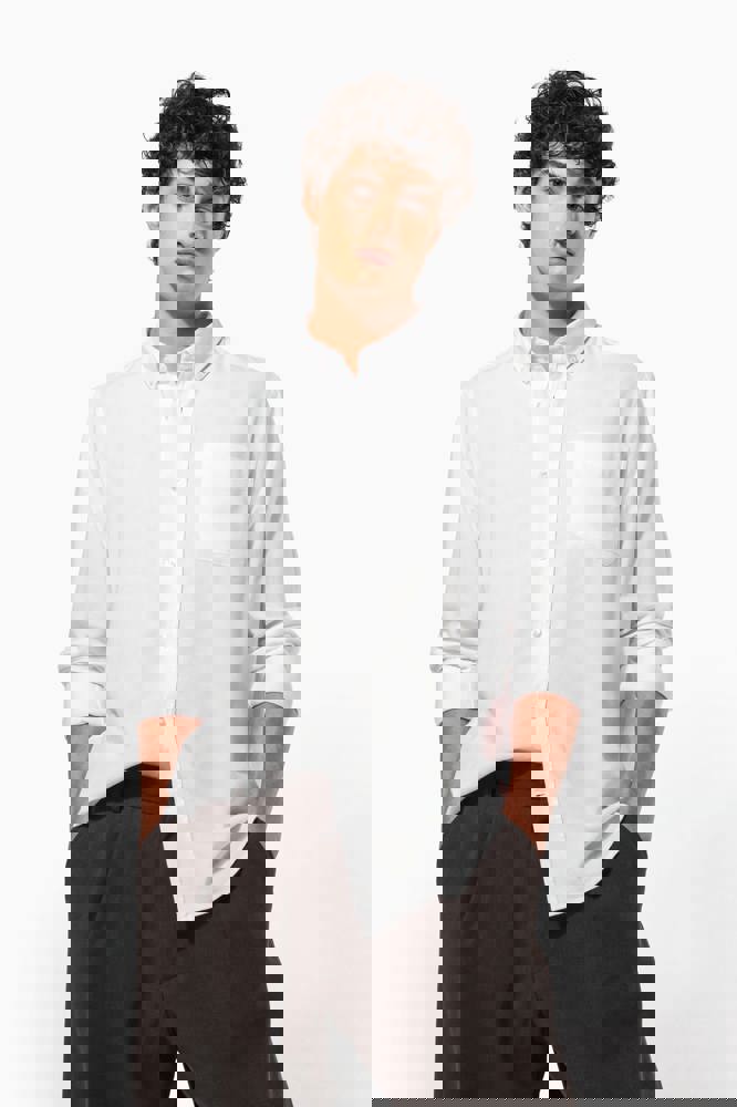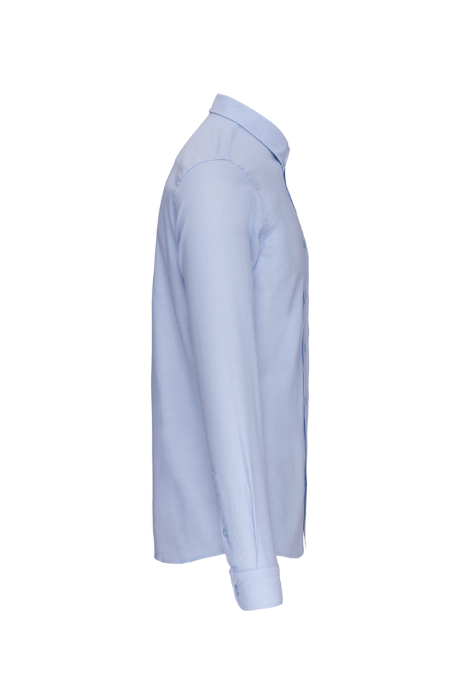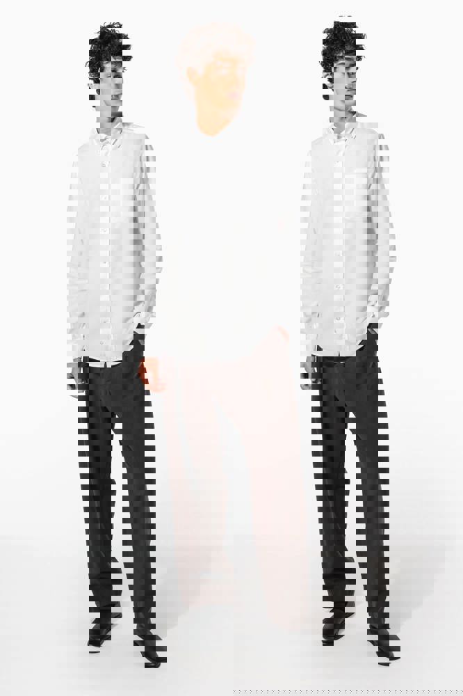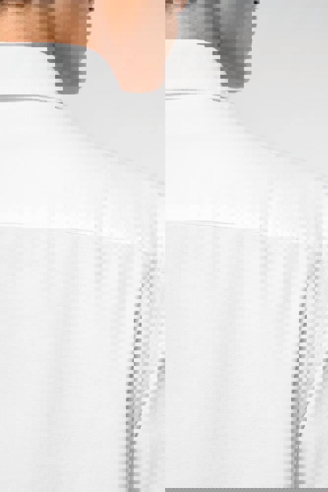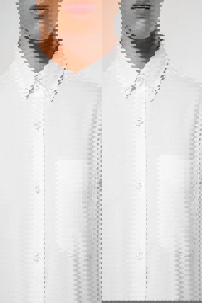 100% katoen. Rechte snit. Button down. Binnenkant van de kraag en mouwuiteinden met een contrastkleurig biesje. Toon op toon knopen. Borstzakje. Dubbel inzetstuk op de rug. Verstelbare mouwuiteinden met knopen. 2 extra knopen. Afgerond boord aan de onderkant.