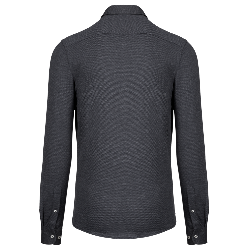68% katoen / 32% polyester. Jacquardtricot. Kraagstaander van contrasterend suèdine. Moderne look. Comfortabele en zachte stof. Klassieke knooplijst met knoop in imitatieparelmoer. Regelbare manchetten met knopen in imitatieparelmoer. Afgeronde boord aan de onderkant.