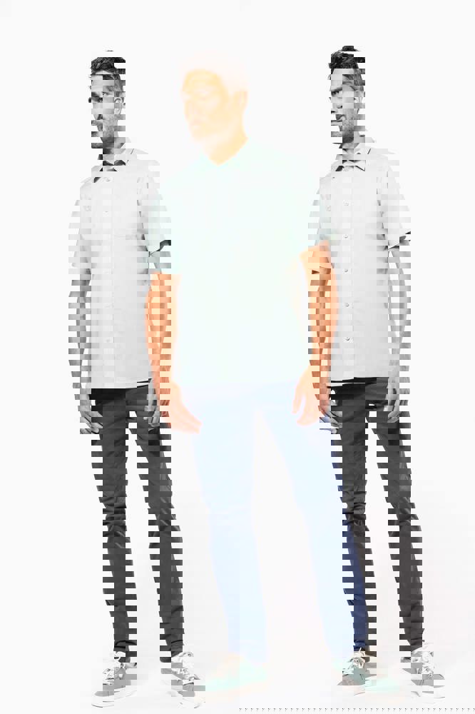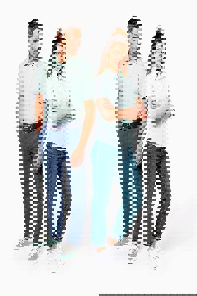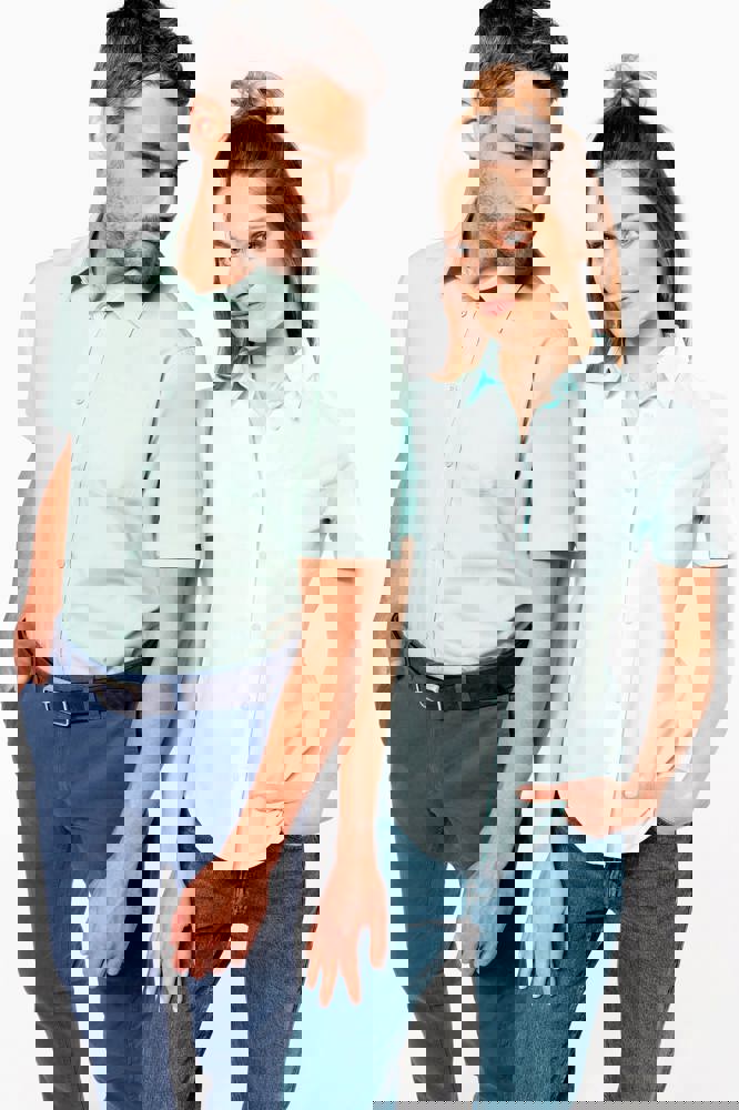 65% polyester / 35% katoen. Gemakkelijk in onderhoud (Easy Care). Verstevigde kraag met baleinen. Toon op toon knopen. Borstzakje. Dubbel inzetstuk op de rug. Afgewerkt met dubbele vouwnaden. Verstelbare mouwen. 2 extra knopen.