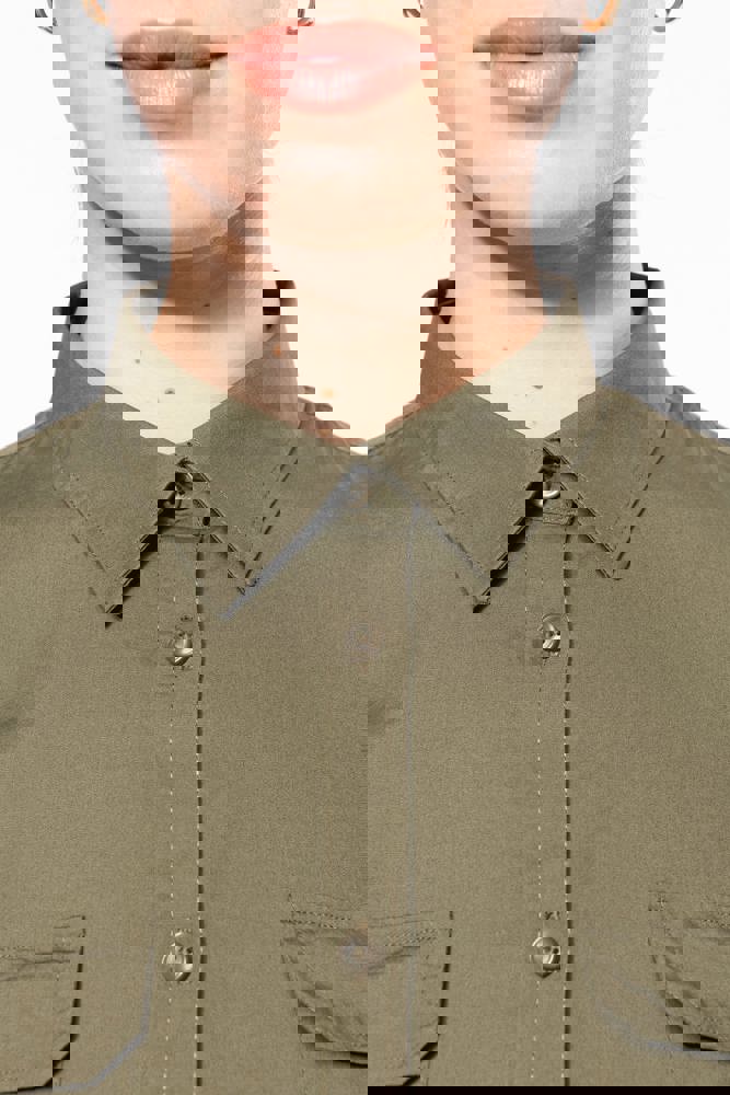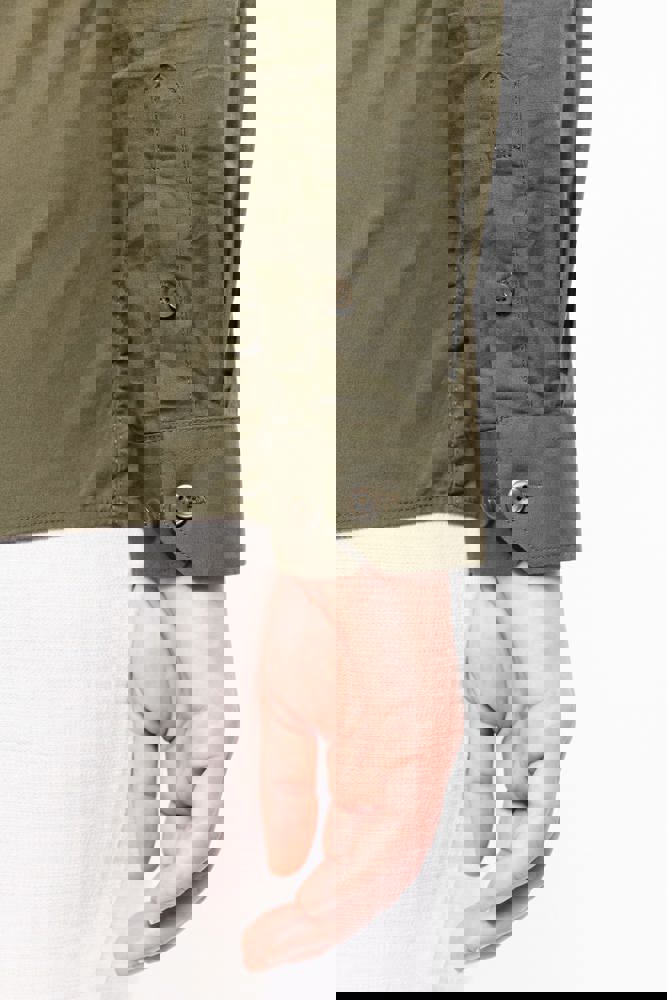 100% katoen. Popeline. Kraag zonder knopen. 2 opgezette zakken met klep aan de voorkant. Verstelbare mouwuiteinden met knoop. Opstroopbare mouwen met een knooplijst. Shirt gewassen. Dit product kreeg een speciale behandeling om het er verouderd te laten uitzien. Dit ambachtelijke procedé maakt dat er kleurverschillen zijn tussen de producten, waardoor elk stuk uniek is.