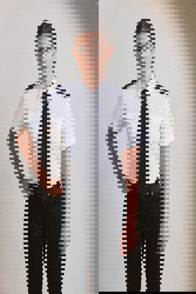 65% polyester / 35% katoen. Popline. Easy Care. Versterkte kraag. 2 borstzakken met overslag en knoopje + penhouder op de linkerzijde. Epauletten niet meegeleverd.