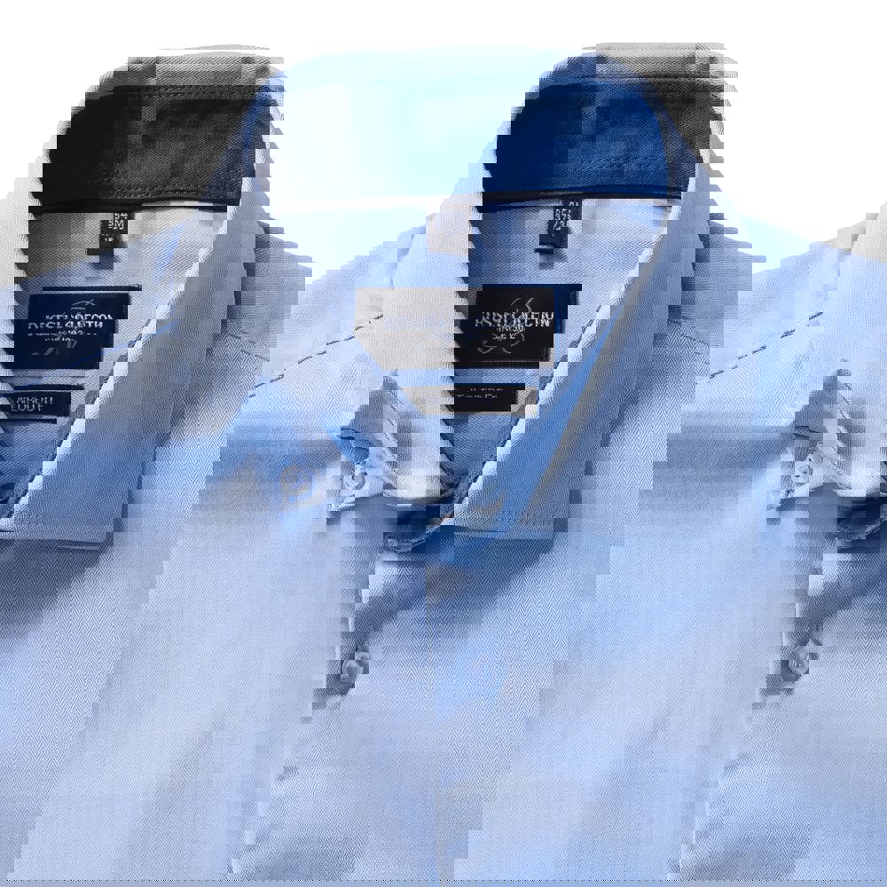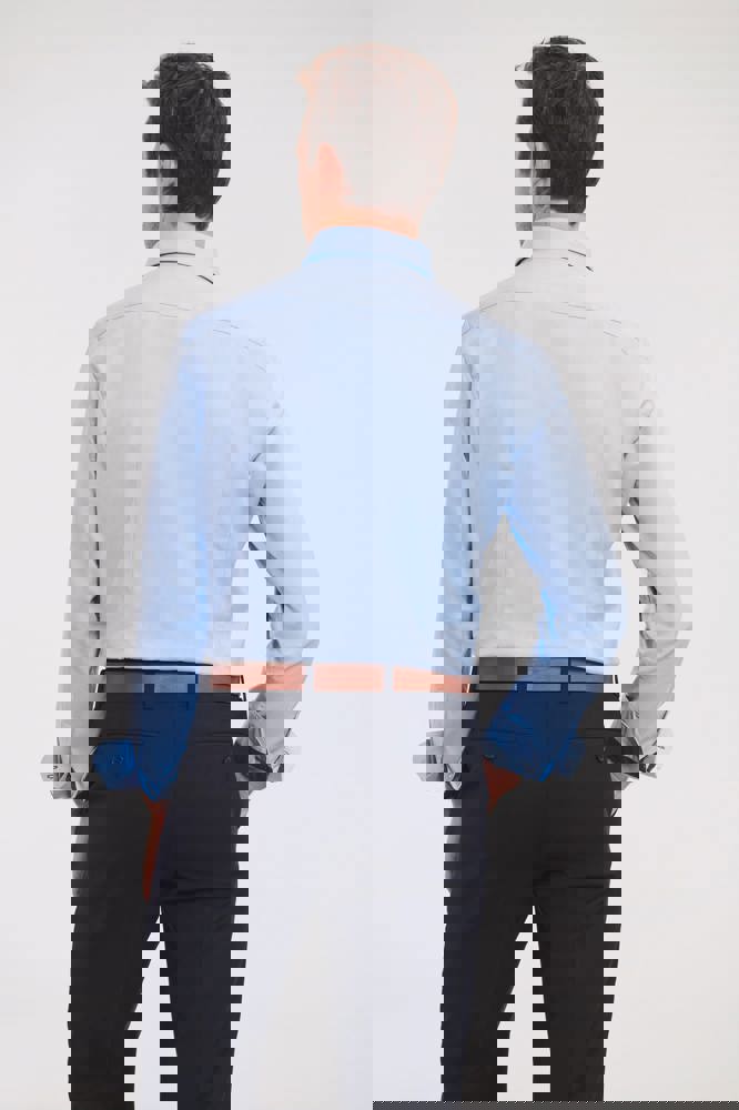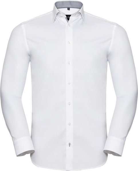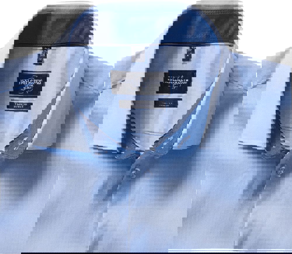 84% katoen / 16% polyester. Getailleerd. Kraagstaander met knopen. Contrasterende elementen: binnenkant manchetten, binnenkant kraag met contrasterende bies. Lage knooplijst met contrasterende boorden. Contrasterende kleuren aan de knoopsgaten van de manchetten en het onderste knoopsgat. Plooien op de achterkant voor een betere pasvorm. Regelbare, afgeronde manchetten met twee knopen. Afgeronde zoom.