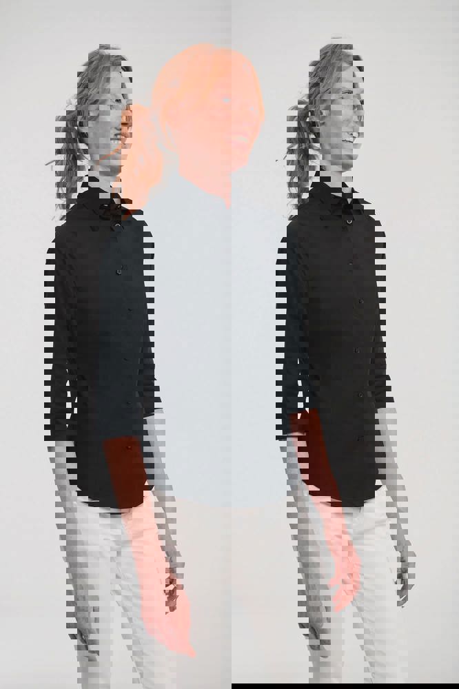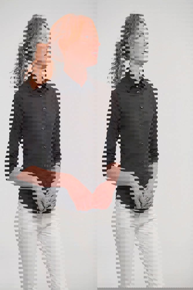 97% katoen / 3% elasthan poplin. Fitted model. Gladde stof met stretch zorgt voor comfort en mooie pasvorm. 1 knoopje aan de kraag. Plooitjes ter hoogte van de borst en aan de achterkant (halverwege). Mouwen kunnen omgeslagen worden. Afgeronde onderkant. Reserveknoopjes. EasyCare.