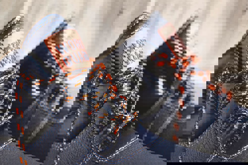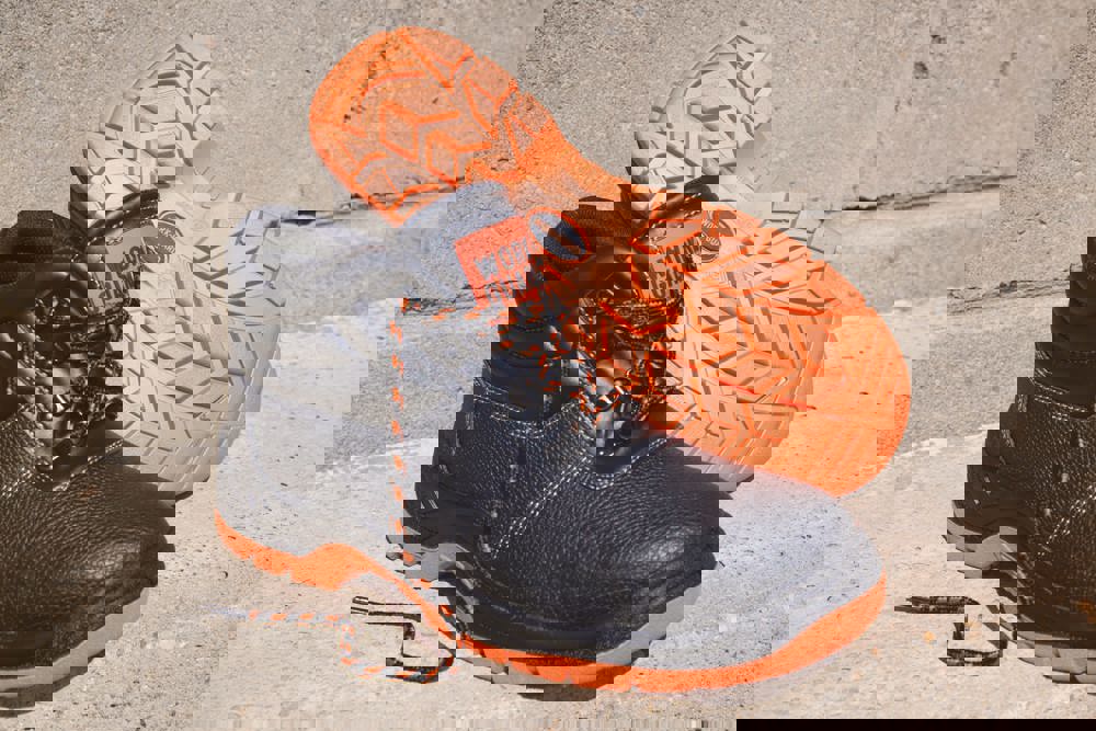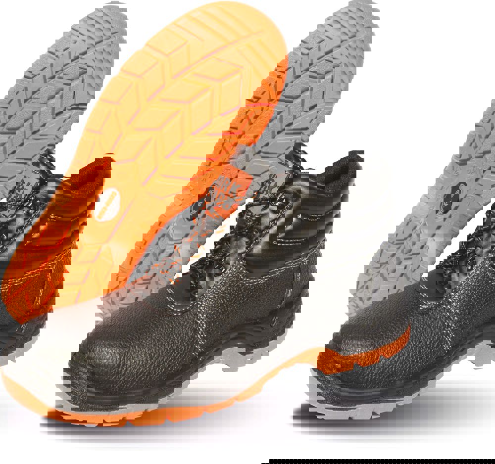 Hoge schoen. Zwarte lederen bovenkant met embossing. Zwart mesh aan de binnenkant ter hoogte van de enkel. Glanzende zwarte eyelets. Inclusief 3 sets veters (Orange, Black en Orange / Black). Duel density PU-zool. Stalen neus en stalen tussenzool voor bescherming onder de voeten. Getwatterde enkelkraag en bovenkant. Schokdempende hiel. Waterbestendig leder. Zool oliebestendig. EN 20345:2011 S1P SRA.