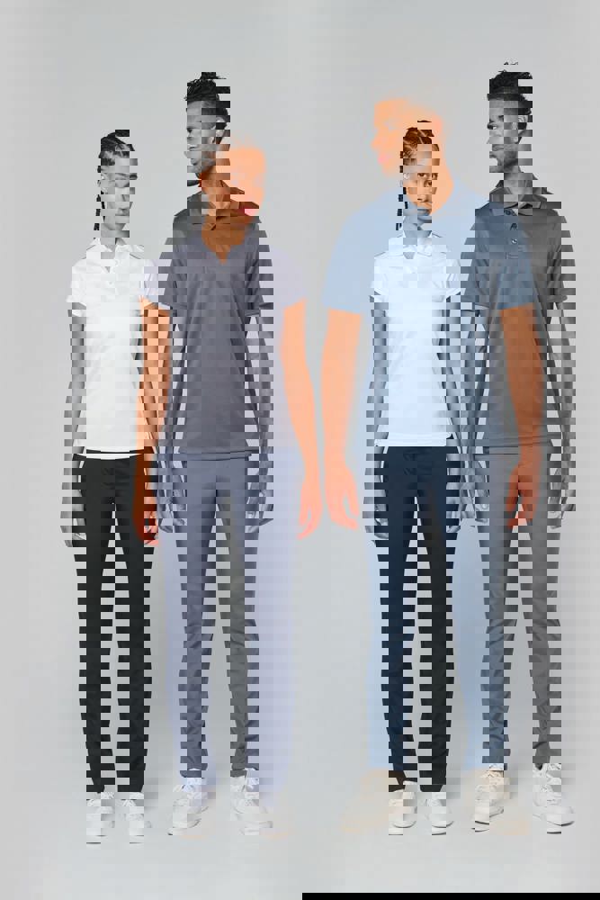 100% polyester interlock. Sneldrogende stof. Kraag in rib. Knooplijst met 3 knopen. Nektape en zijsplitjes in contrastkleur. Contrastkleurige bies op de schouders. Afwerking met dubbele stiksels aan de mouwuiteinden en onderaan.