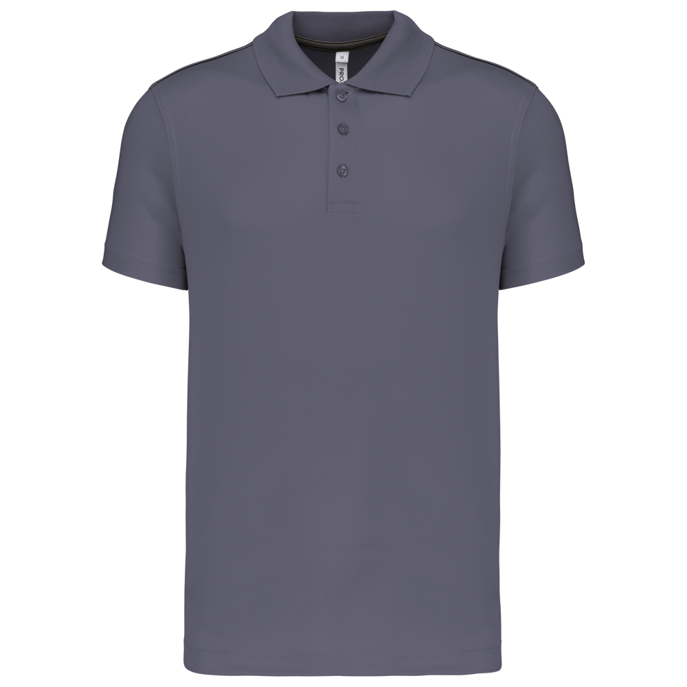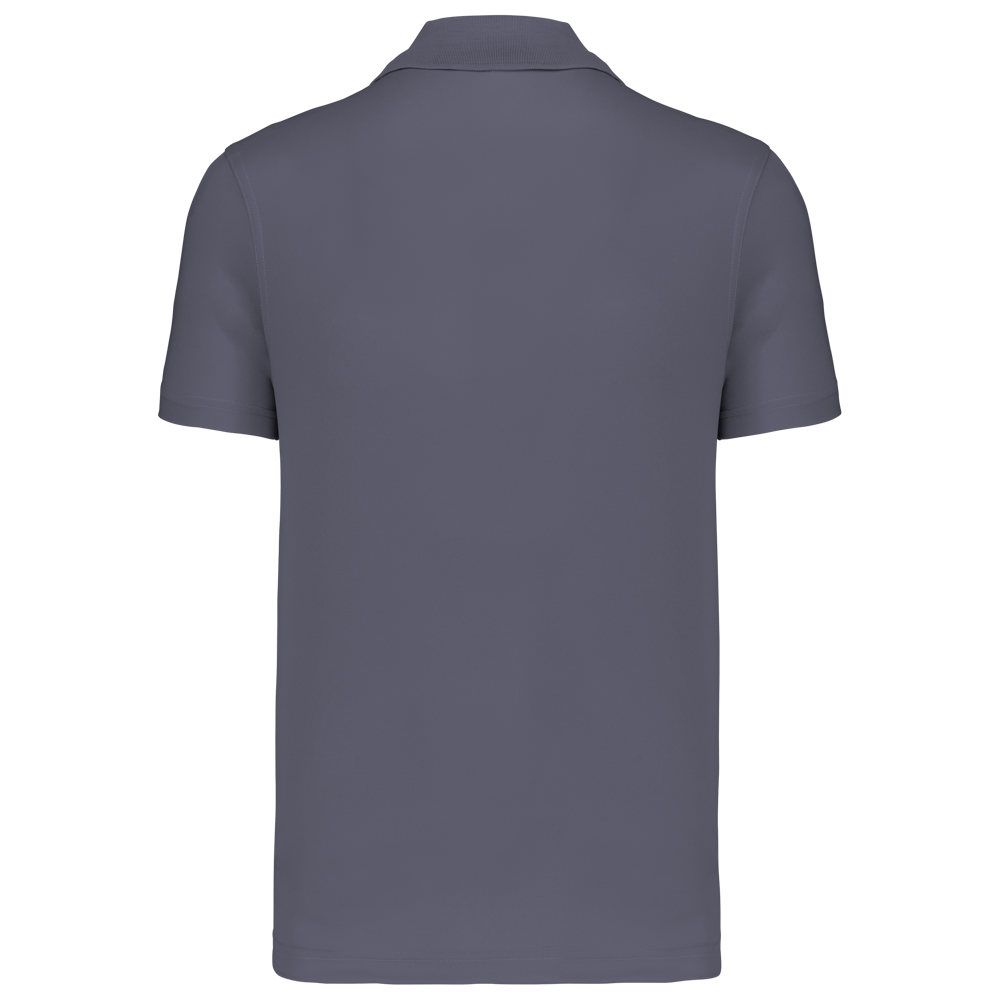 100% polyester interlock. Sneldrogende stof. Kraag in rib. Knooplijst met 3 knopen. Nektape en zijsplitjes in contrastkleur. Contrastkleurige bies op de schouders. Afwerking met dubbele stiksels aan de mouwuiteinden en onderaan.