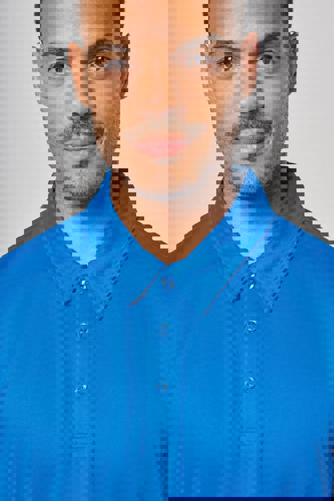 50% polyester Cool Plus® / 50% polyester. Ademende stof. Knooplijst met 3 knopen. Afwerking met dubbele stiksels aan de mouwen en onderaan.