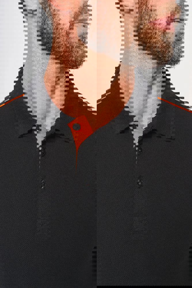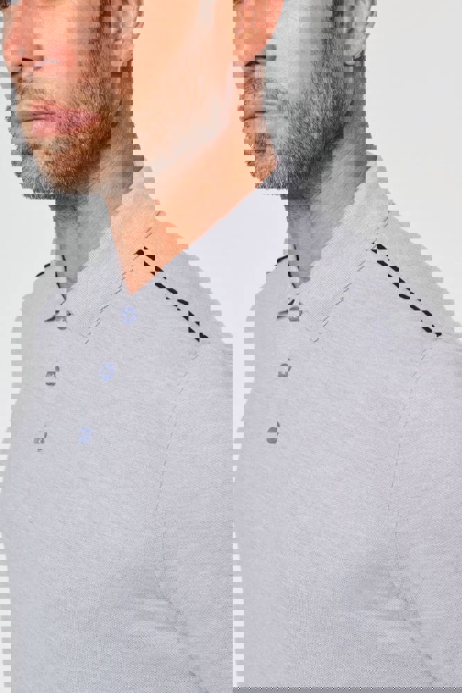 65% polyester / 35% katoen. Gekamd katoen piquétricot. Wasbaar op 60 °C. Anti-pluisbehandeling. Lijst met 3 knopen en contrasterende bies aan de binnenkant. Kraag in ribboord met nektape aan de binnenkant. Contrasterende bies aan binnenkant kraag en schouders. Ribboord met contrasterende bies aan de mouwuiteinden. Zijsplitten met contrasterend visgraatmotief voor meer comfort. Afwerking met dubbel stiksel onderaan. Ideaal voor dagelijks gebruik.