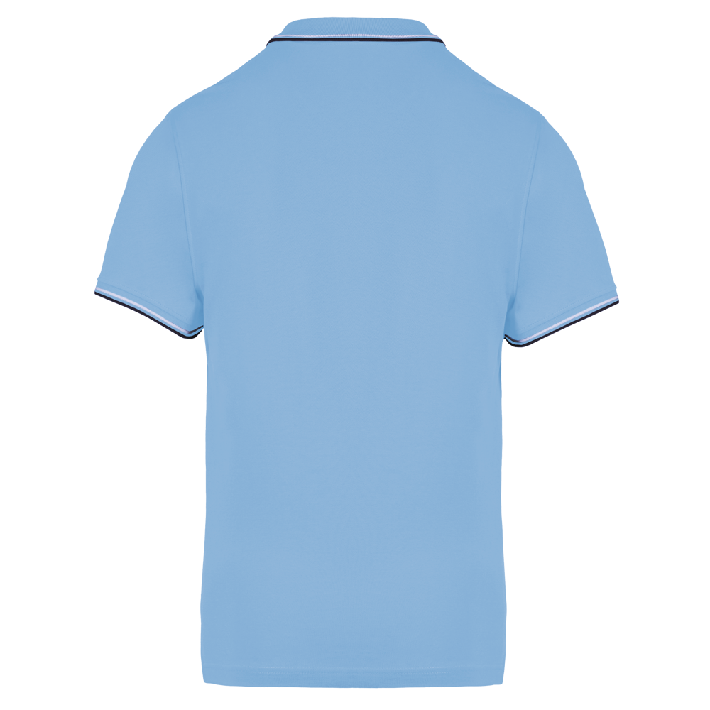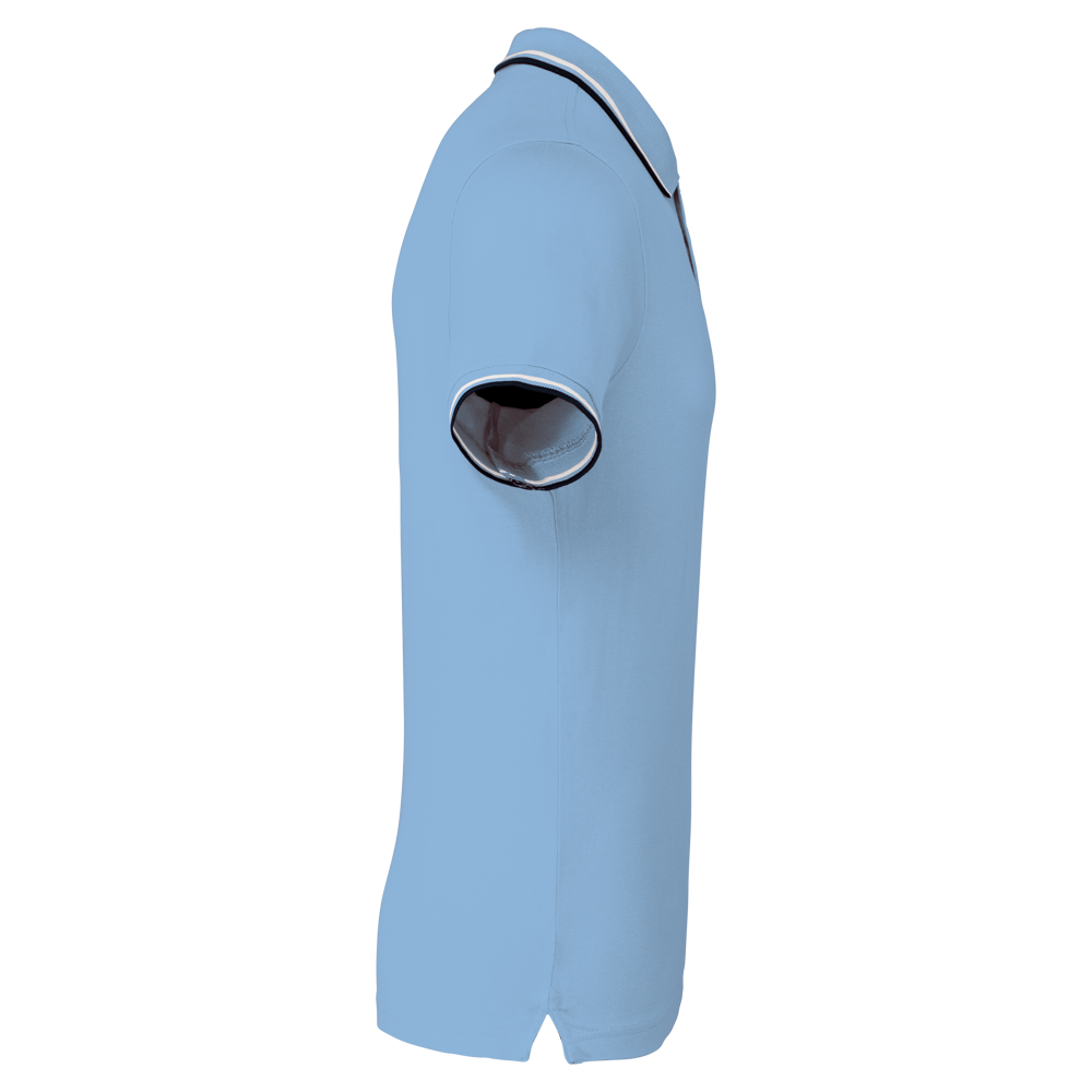 100% katoen piqué. Knooplijst met 3 knopen. Nektape en zijsplitjes in contrastkleur. Afwerking in rib met gecontrasteerde rand aan de kraag en mouwuiteinden. Afgewerkt met dubbele stiksels onderaan.