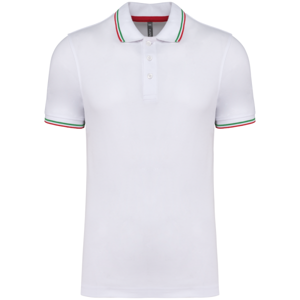 100% katoen piqué. Knooplijst met 3 knopen. Nektape en zijsplitjes in contrastkleur. Afwerking in rib met gecontrasteerde rand aan de kraag en mouwuiteinden. Afgewerkt met dubbele stiksels onderaan.