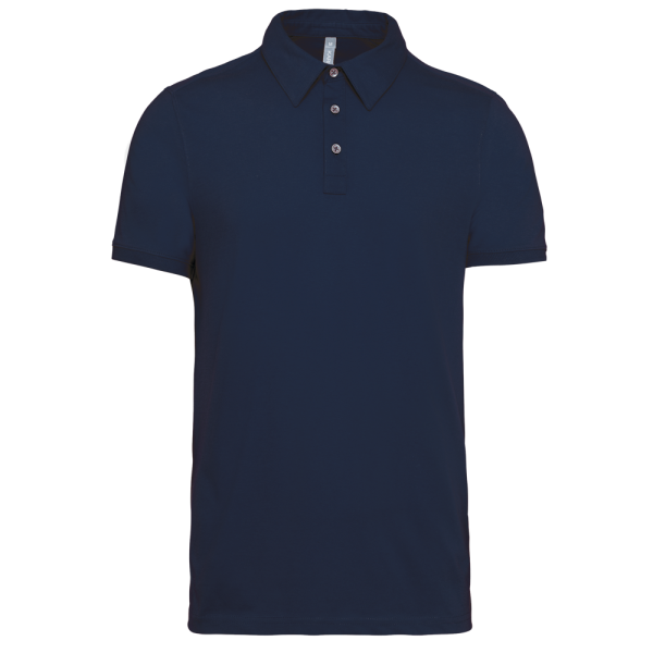 100% gekamd katoen (French Navy Heather: 80% katoen / 20% polyester - Grey Heather: 65% polyester/35% katoen - Oxford Grey : 90% katoen / 10% viscose). Jersey. Hemdskraag. Knooplijst met 3 metalen knopen. Inzetstuk op de schouder. Afgewerkt met ribboord aan de mouwuiteinden. Dubbel stiksel aan de onderkant.