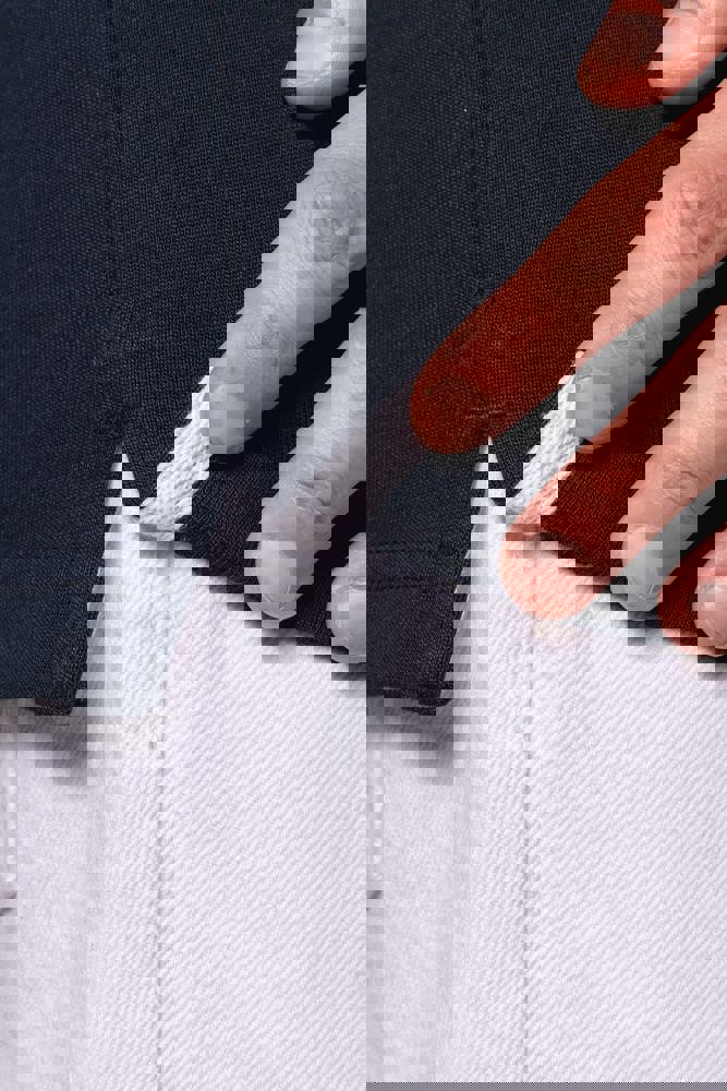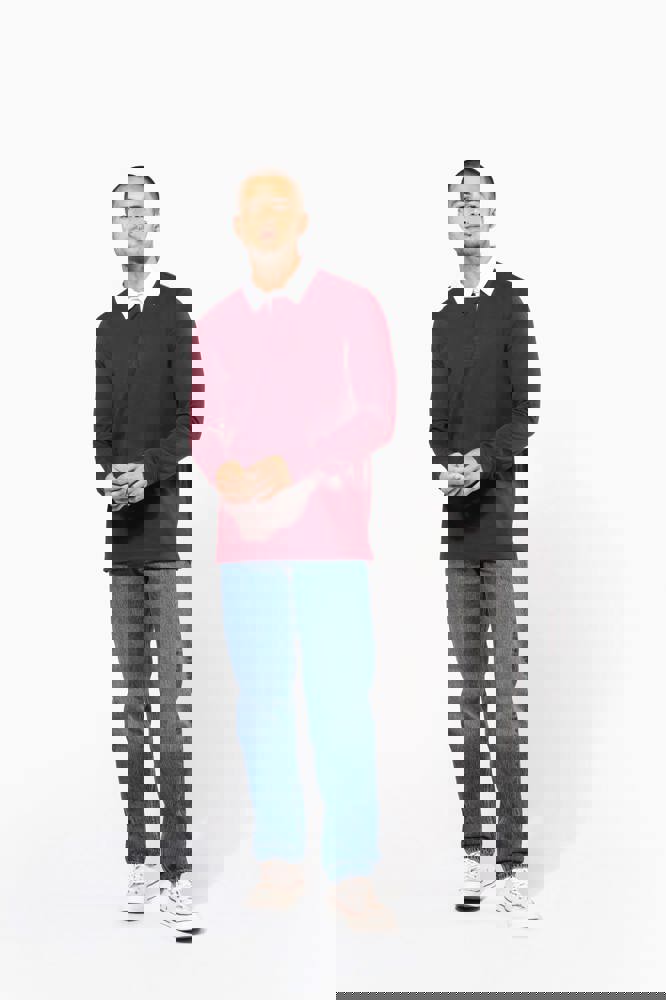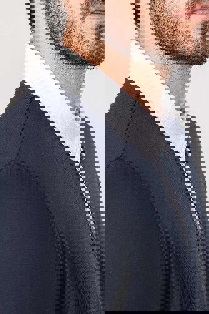 100% Gekamd katoen. Voorgekrompen gekamd jerseykatoen. Kraag in contrasterend wit twillkatoen (behalve de kleuren Red en Dark Grey, die een zwarte kraag hebben). Lijst met 3 knopen. Mouwuiteinden in 1x1 ribboord. Afwerking met visgraatmotief op de binnenzijde van de kraag en aan de zijsplitten.