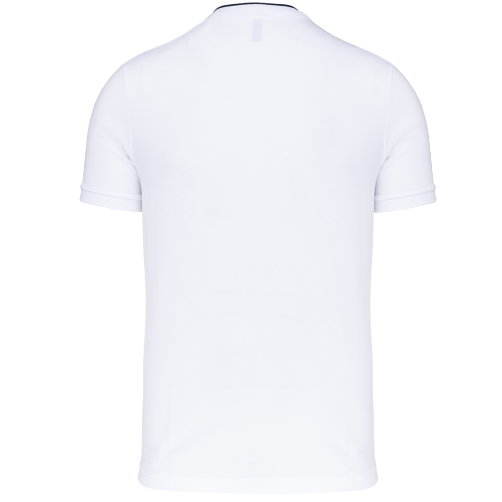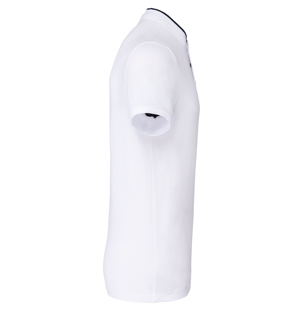 100% katoen. (90% katoen / 10% viscose voor chiné kleur). Katoenen, gekamd piquétricot. Wasbaar op 60 °C (40 °C voor chiné kleur) Kraag in maostijl in ribboord met contrasterende bies. Knooplijst met 3 contrasterende knopen. Ribboord aan mouwuiteinden. Dubbel stiksel aan de onderkant.