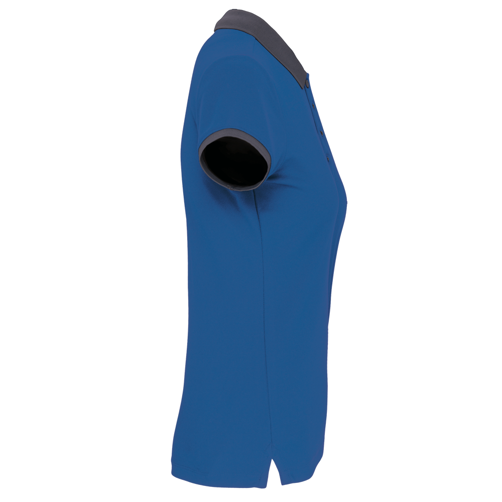 100% piquépolyester Cool Plus®. Getailleerde snit en moderne look. Kraag en mouwuiteinden in contrasterende ribboord. Knoopsluiting met 4 knopen (contrasterend of effen, afhankelijk van het model). Zijsplitten.
