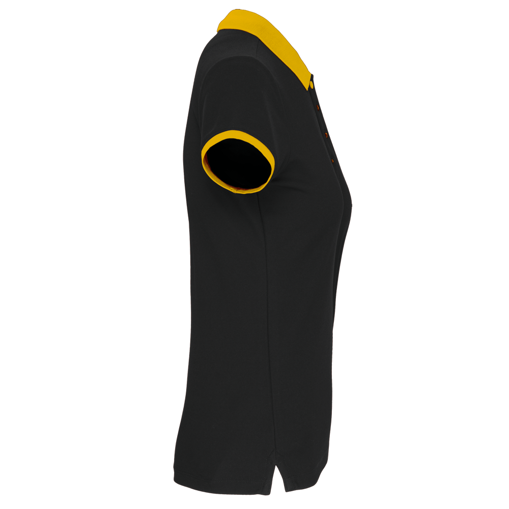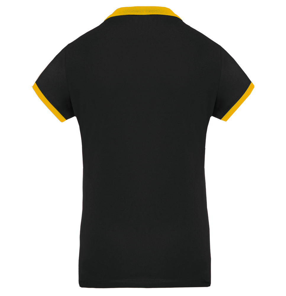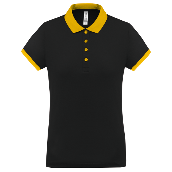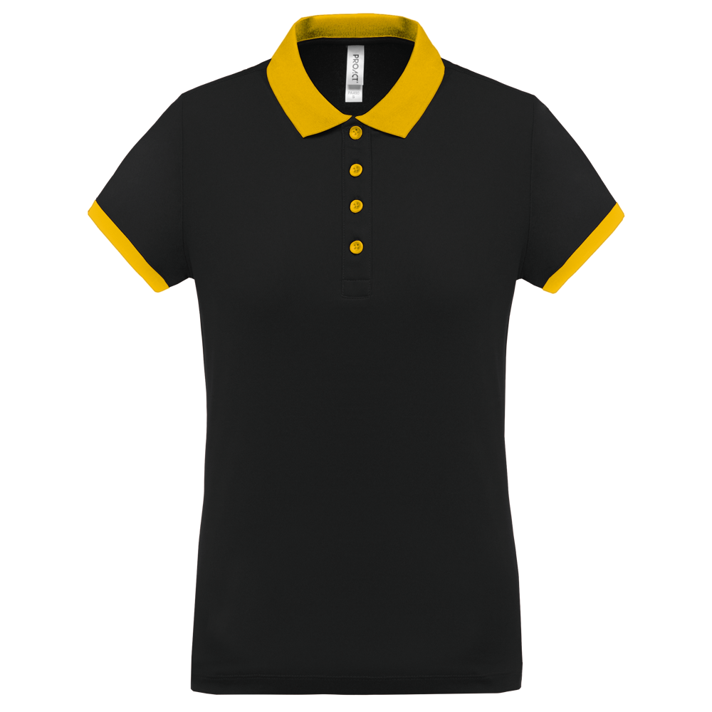 100% piquépolyester Cool Plus®. Getailleerde snit en moderne look. Kraag en mouwuiteinden in contrasterende ribboord. Knoopsluiting met 4 knopen (contrasterend of effen, afhankelijk van het model). Zijsplitten.