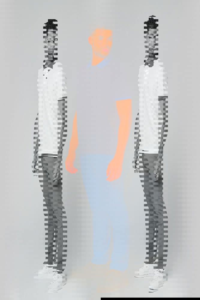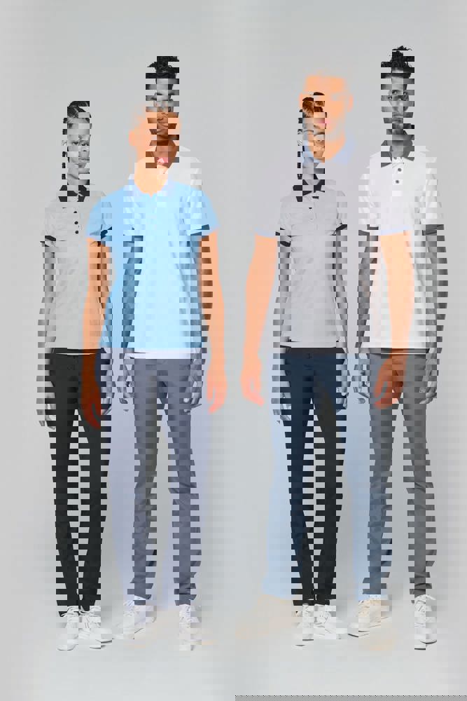 100% piquépolyester Cool Plus®. Rechte snit en moderne look. Kraag en mouwuiteinden in contrasterende ribboord. Knoopsluiting met 3 knopen (contrasterend of effen, afhankelijk van het model). Zijsplitten.