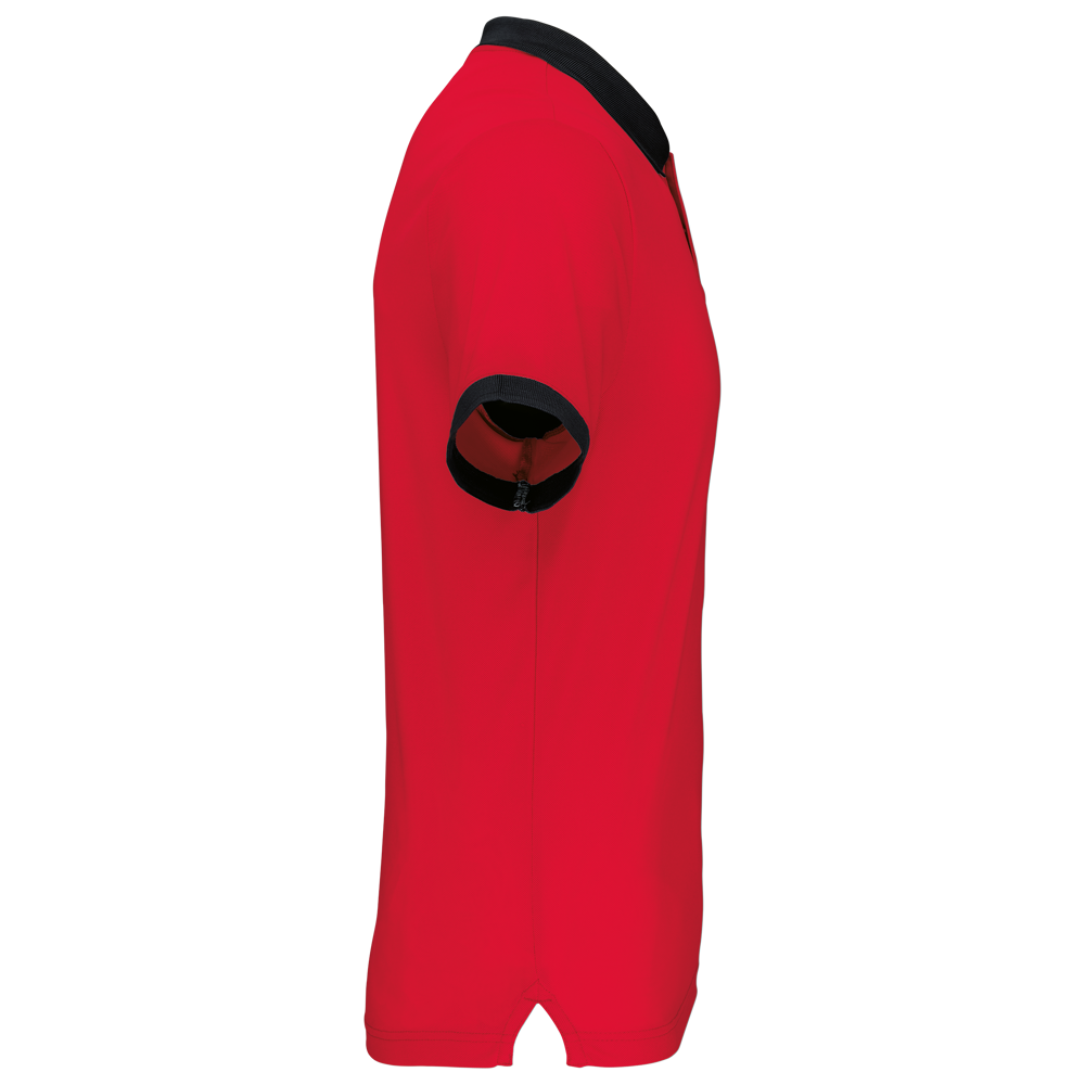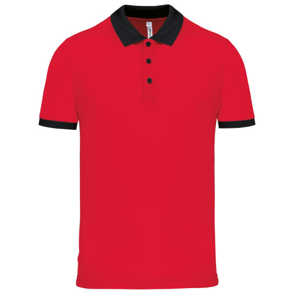 100% piquépolyester Cool Plus®. Rechte snit en moderne look. Kraag en mouwuiteinden in contrasterende ribboord. Knoopsluiting met 3 knopen (contrasterend of effen, afhankelijk van het model). Zijsplitten.