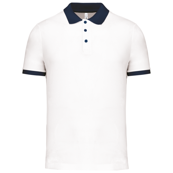 100% piquépolyester Cool Plus®. Rechte snit en moderne look. Kraag en mouwuiteinden in contrasterende ribboord. Knoopsluiting met 3 knopen (contrasterend of effen, afhankelijk van het model). Zijsplitten.