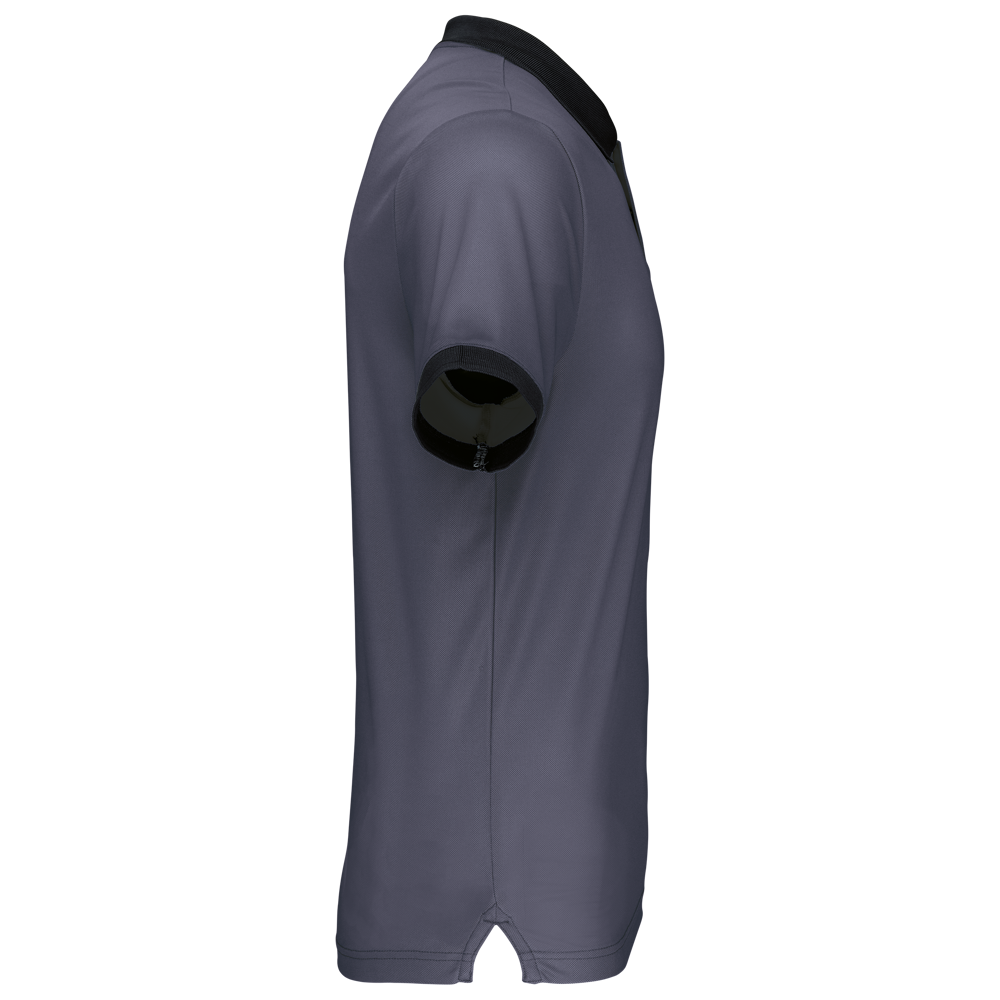 100% piquépolyester Cool Plus®. Rechte snit en moderne look. Kraag en mouwuiteinden in contrasterende ribboord. Knoopsluiting met 3 knopen (contrasterend of effen, afhankelijk van het model). Zijsplitten.