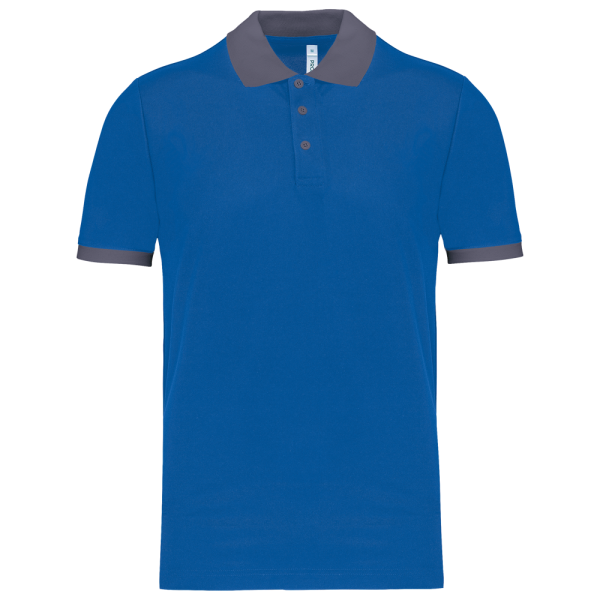 100% piquépolyester Cool Plus®. Rechte snit en moderne look. Kraag en mouwuiteinden in contrasterende ribboord. Knoopsluiting met 3 knopen (contrasterend of effen, afhankelijk van het model). Zijsplitten.