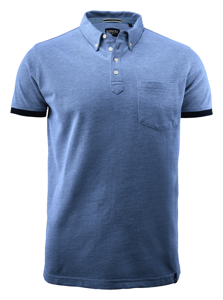 Polo piqué met buttondown kraag en details in oxford aan de binnenzijde. Contrasterende ribboord aan de manchetten en lusje met Harvest-logo aan de zoom. Borstzak op linkerborst.