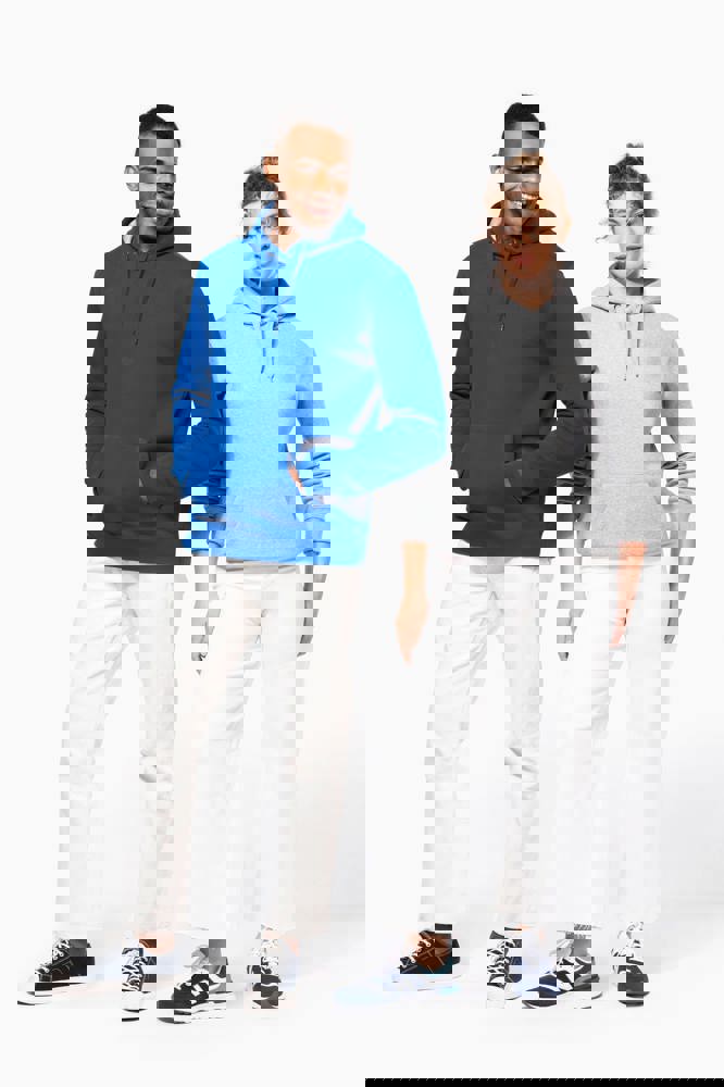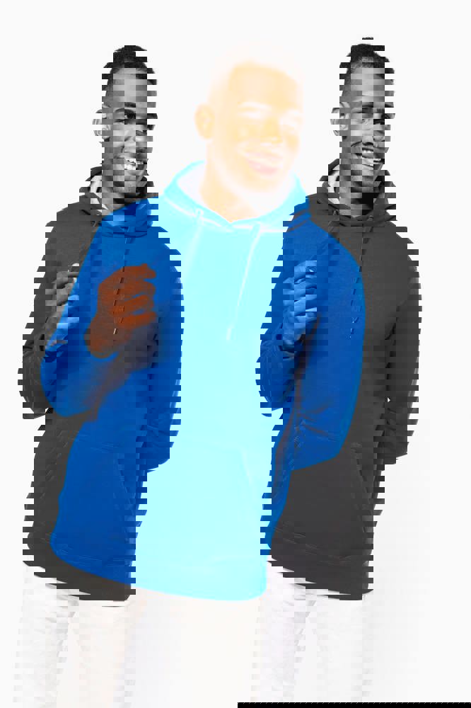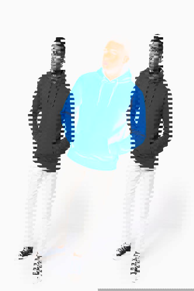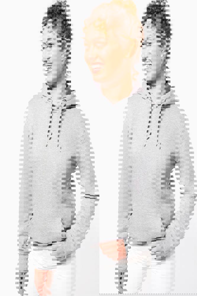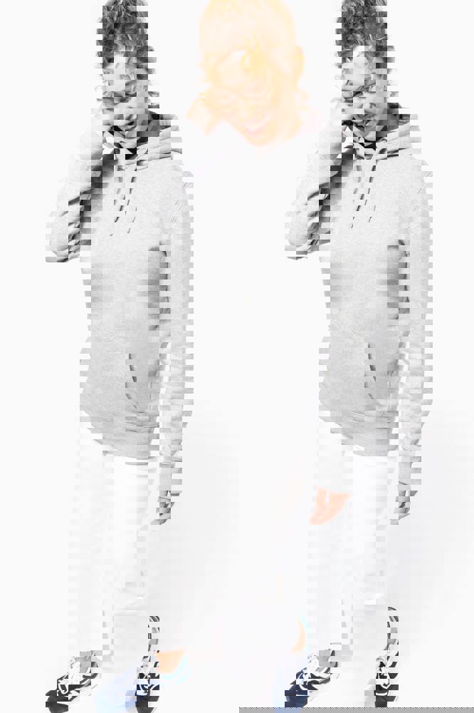 80% katoen / 20% polyester. Gekamd katoen. Voorgekrompen en gekamd fleece aan binnenkant sweater. Sillicone wash. Gecontrasteerd nektape. Gecontrasteerde capuchon. 'Kangaroe' zak aan de voorkant. Afwerking in ribboord.