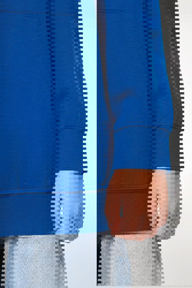 80% katoen / 20% polyester. Gekamd katoen. Geborsteld fleece aan de binnenkant. 'Kangaroe' zak aan de voorkant met gaatje voor draadje en lusje aan de kraag voor mp3-oortjes. Afwerking in ribboord. Gevoerde en gecontrasteerde capuchon.