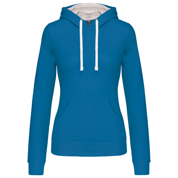 80% katoen / 20% polyester. Gekamd katoen. Geborsteld fleece aan de binnenkant. Gaatje voor draadje in de kangoeroezak en lusje aan de kraag voor oortjes. Ribboord aan mouwuiteinden en onderkant kledingstuk. Gevoerde capuchon in contrasterende kleur met aanrijgkoordjes.