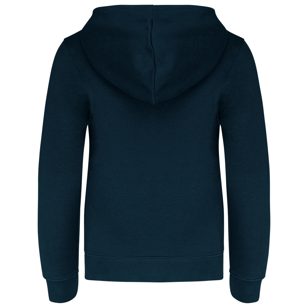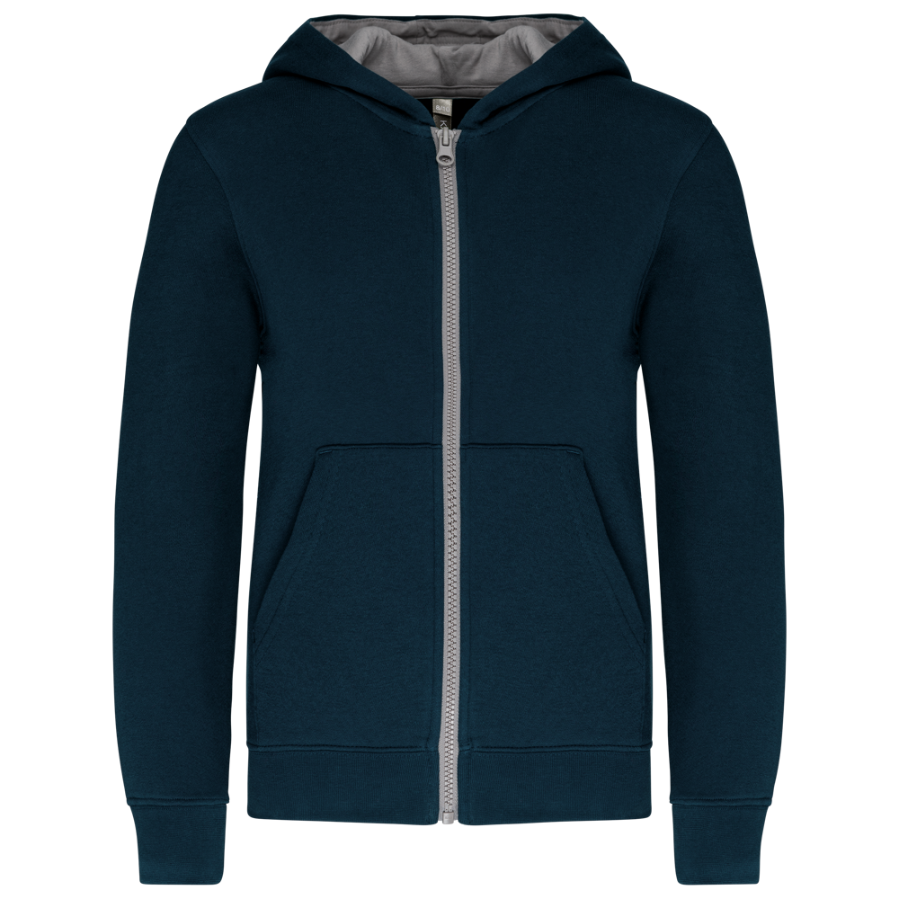 80% gekamd katoen / 20% polyester (Oxford Grey: 76% gekamd katoen / 21% polyester / 3% viscose). Geborsteld fleece aan de binnenkant. Ribboord aan mouwuiteinden en onderkant kledingstuk. Gevoerde capuchon in contrasterende kleur. Contrasterende rits. Opening voor headset-snoer in de kangoeroezak en halsopening.