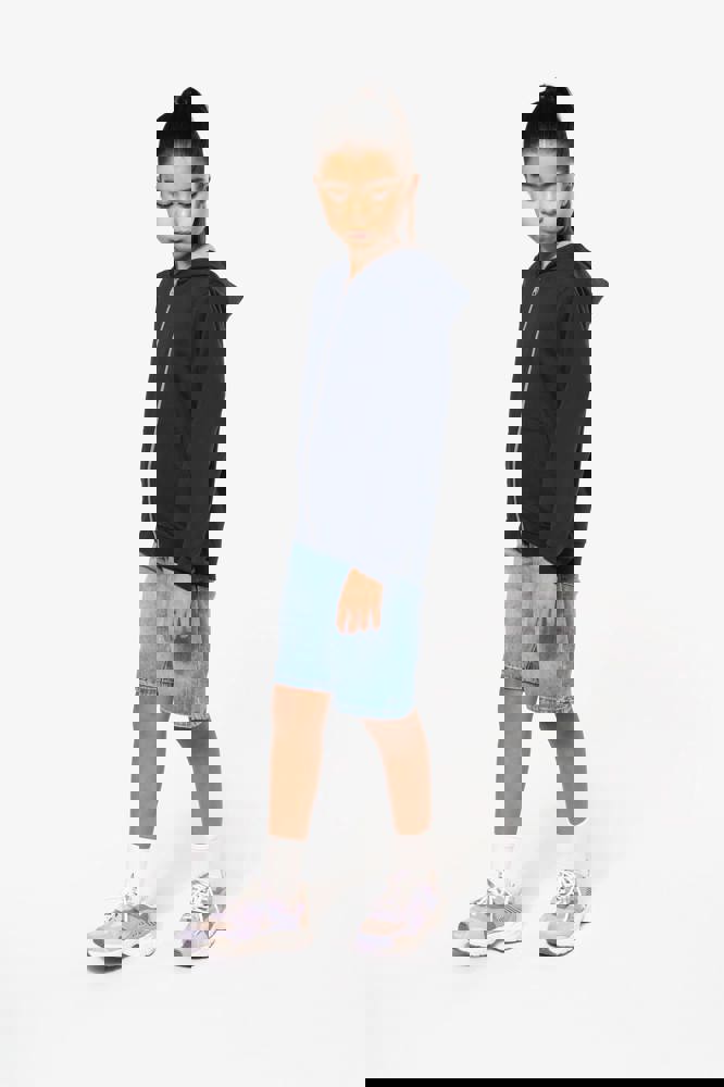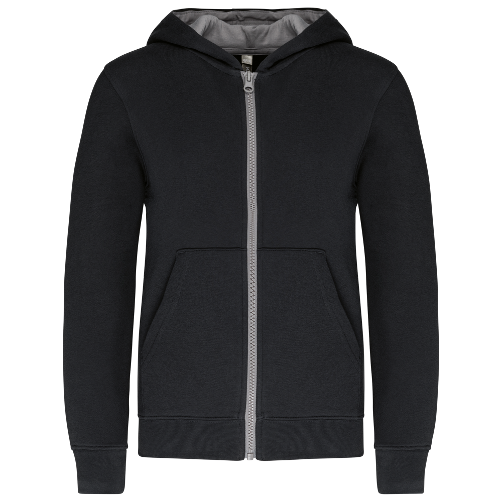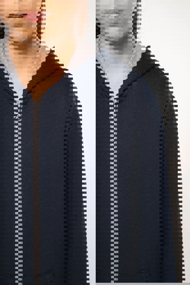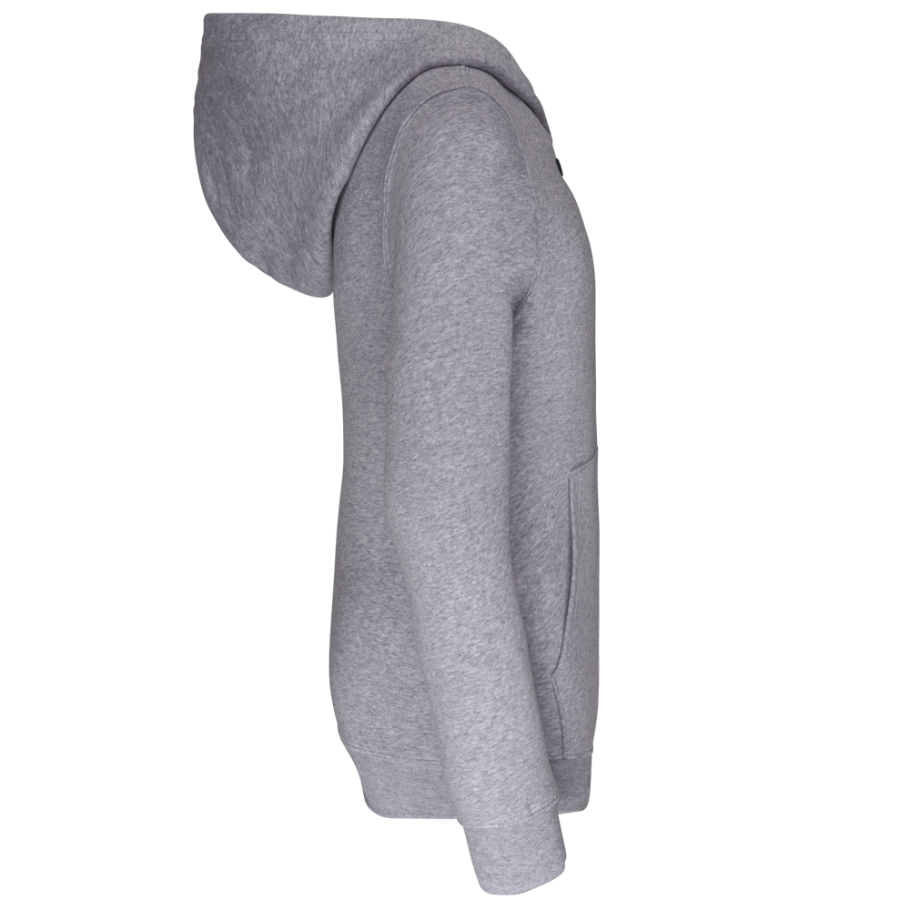 80% gekamd katoen / 20% polyester (Oxford Grey: 76% gekamd katoen / 21% polyester / 3% viscose). Geborsteld fleece aan de binnenkant. Ribboord aan mouwuiteinden en onderkant kledingstuk. Gevoerde capuchon in contrasterende kleur. Contrasterende rits. Opening voor headset-snoer in de kangoeroezak en halsopening.