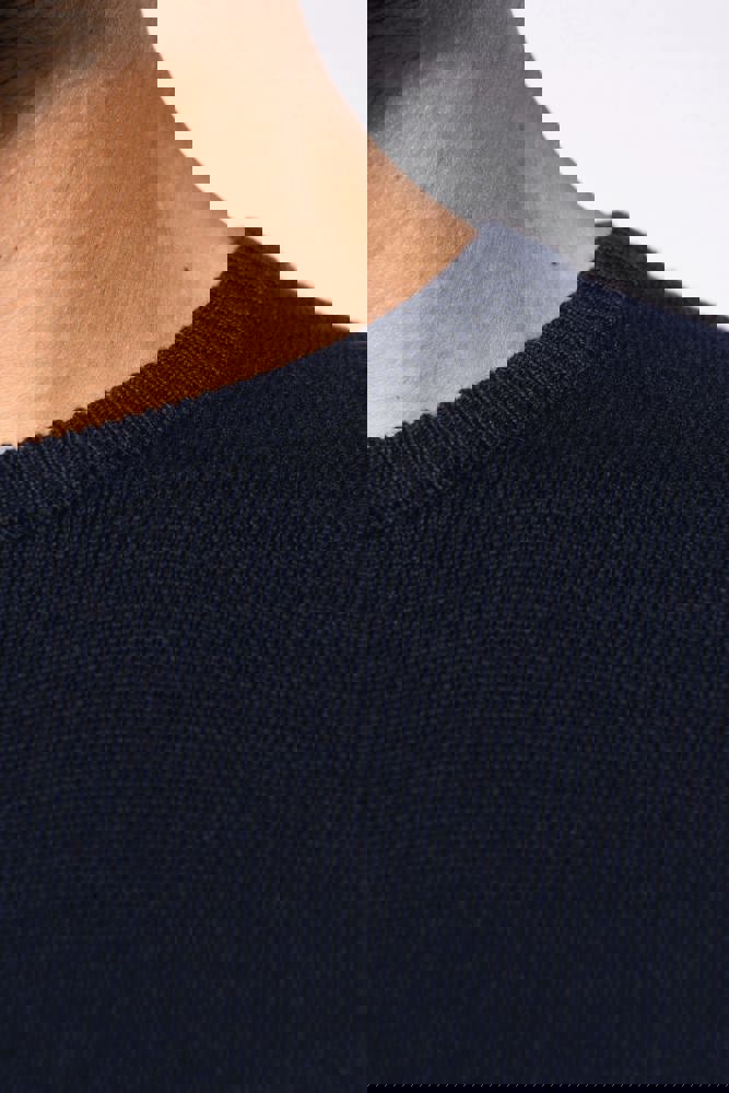 50% katoen / 50% acryl. Rechte snit. 2-laagse kraag in rib. Nektape.