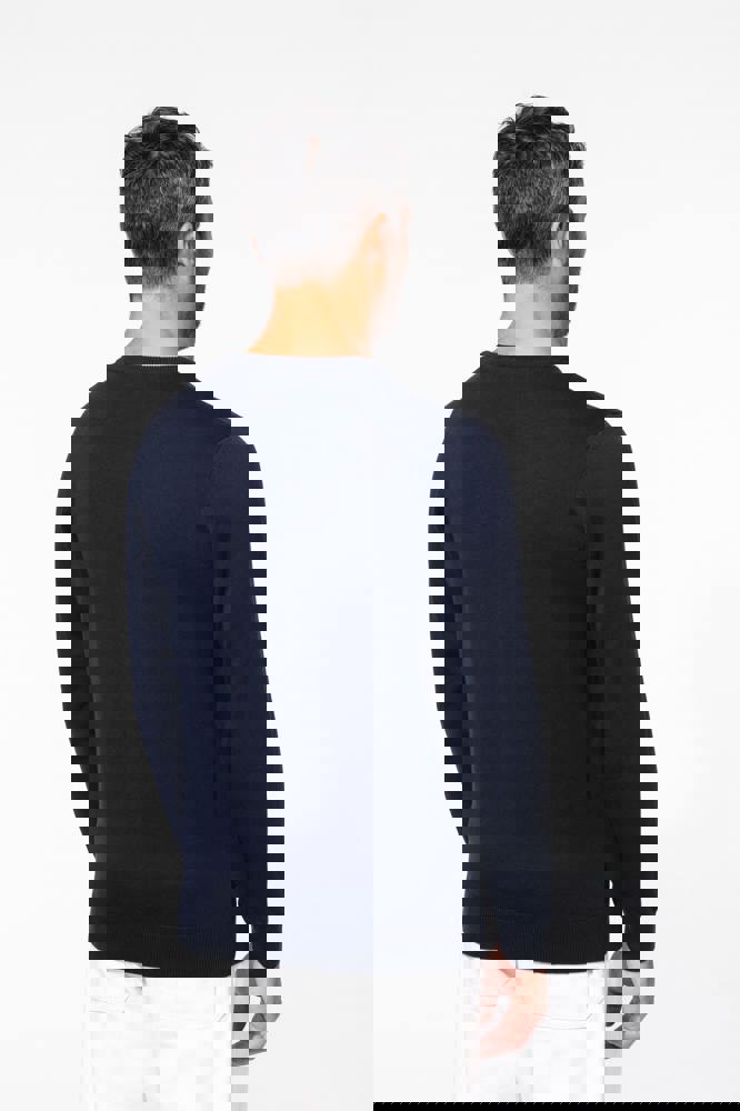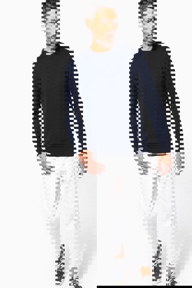 50% katoen / 50% acryl. Rechte snit. 2-laagse kraag in rib. Nektape.meer