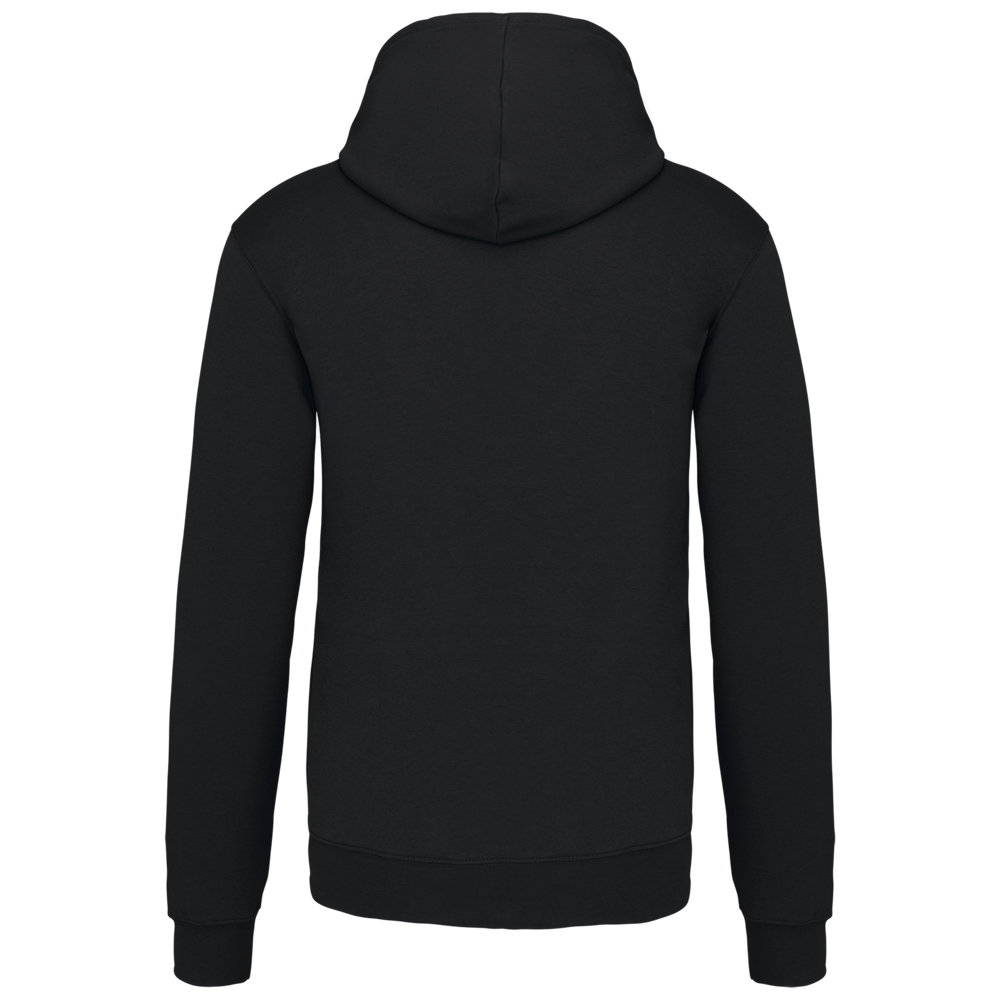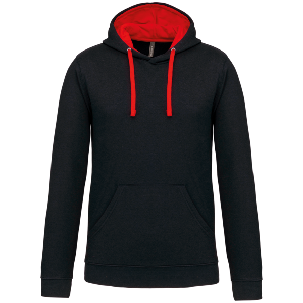 80% katoen / 20% polyester. Gekamd katoen. Geborsteld fleece aan de binnenkant. 'Kangaroe' zak aan de voorkant met gaatje voor draadje en lusje aan de kraag voor mp3-oortjes. Afwerking in ribboord. Gevoerde en gecontrasteerde capuchon met aanrijgkoordjes.