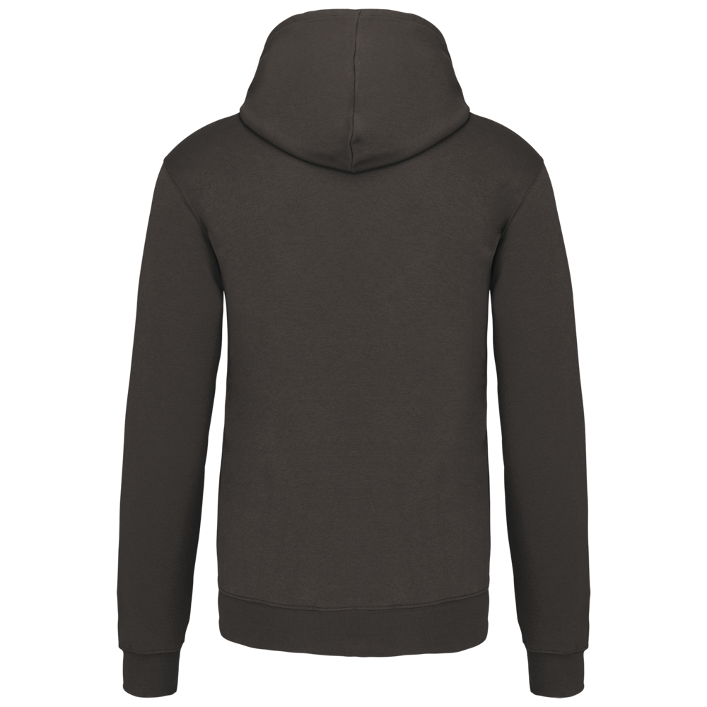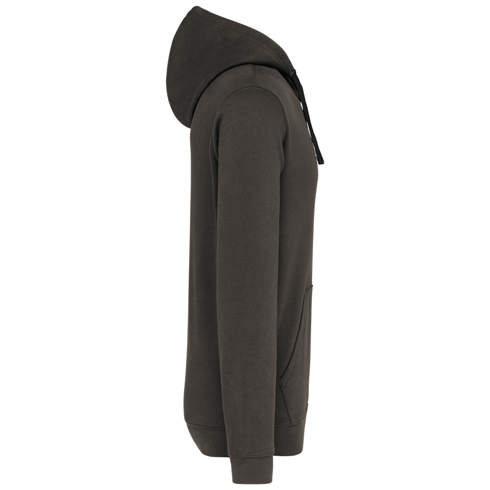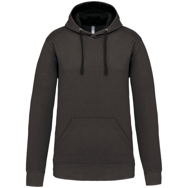 80% katoen / 20% polyester. Gekamd katoen. Geborsteld fleece aan de binnenkant. 'Kangaroe' zak aan de voorkant met gaatje voor draadje en lusje aan de kraag voor mp3-oortjes. Afwerking in ribboord. Gevoerde en gecontrasteerde capuchon met aanrijgkoordjes.