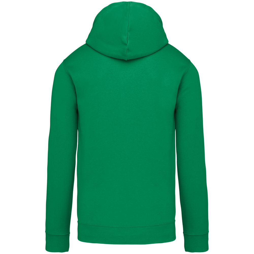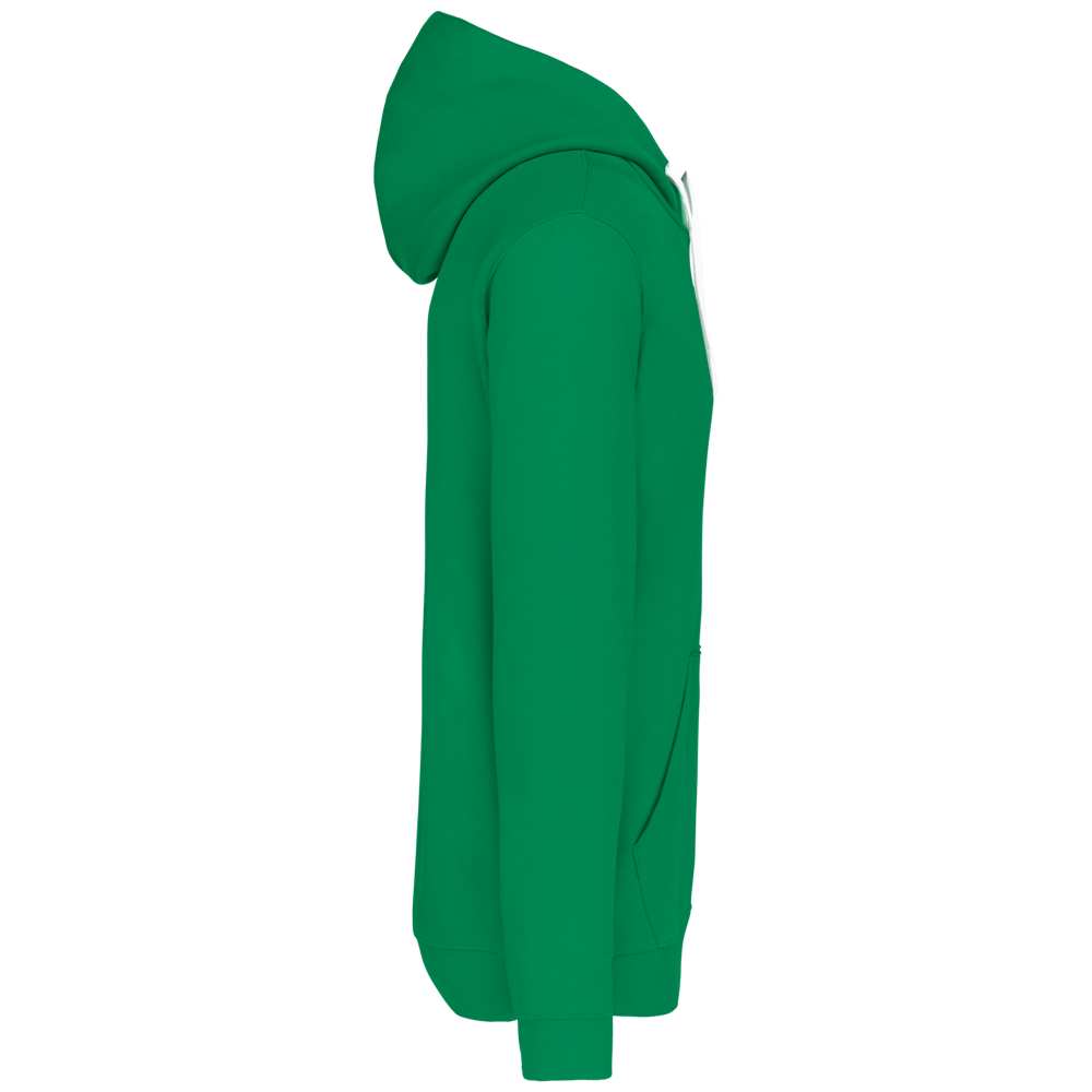 80% katoen / 20% polyester. Gekamd katoen. Geborsteld fleece aan de binnenkant. 'Kangaroe' zak aan de voorkant met gaatje voor draadje en lusje aan de kraag voor mp3-oortjes. Afwerking in ribboord. Gevoerde en gecontrasteerde capuchon met aanrijgkoordjes.