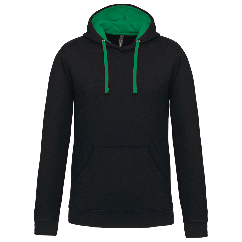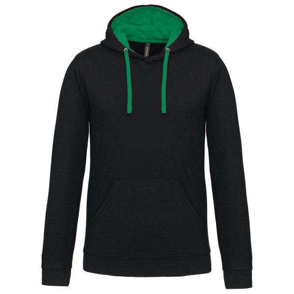 80% katoen / 20% polyester. Gekamd katoen. Geborsteld fleece aan de binnenkant. 'Kangaroe' zak aan de voorkant met gaatje voor draadje en lusje aan de kraag voor mp3-oortjes. Afwerking in ribboord. Gevoerde en gecontrasteerde capuchon met aanrijgkoordjes.