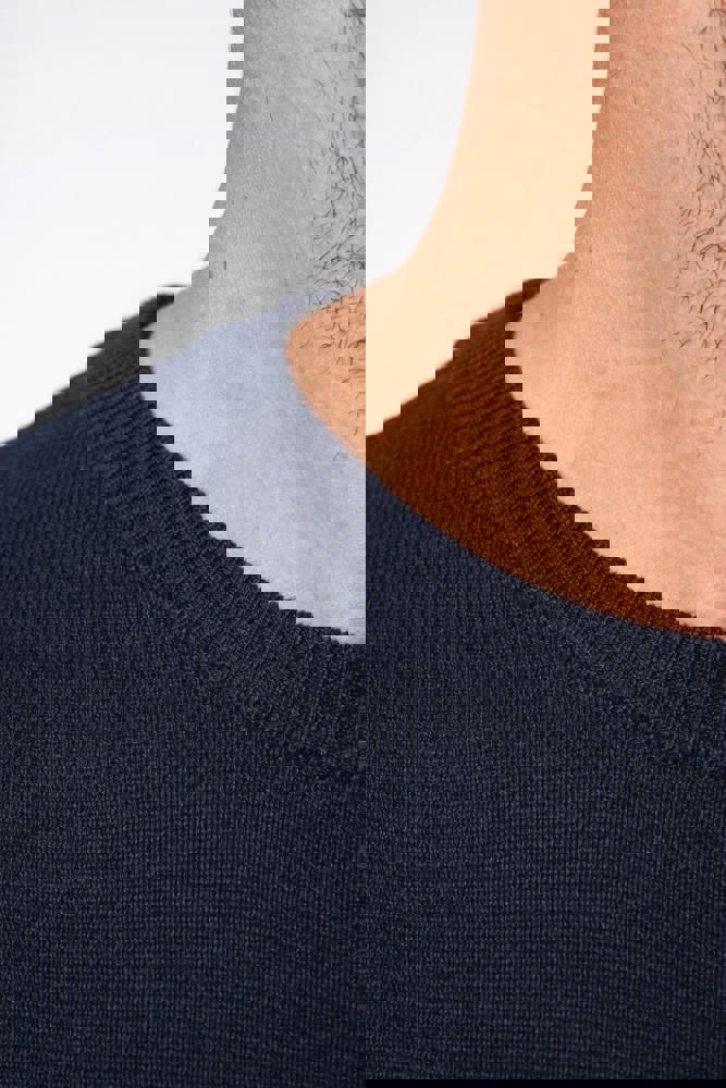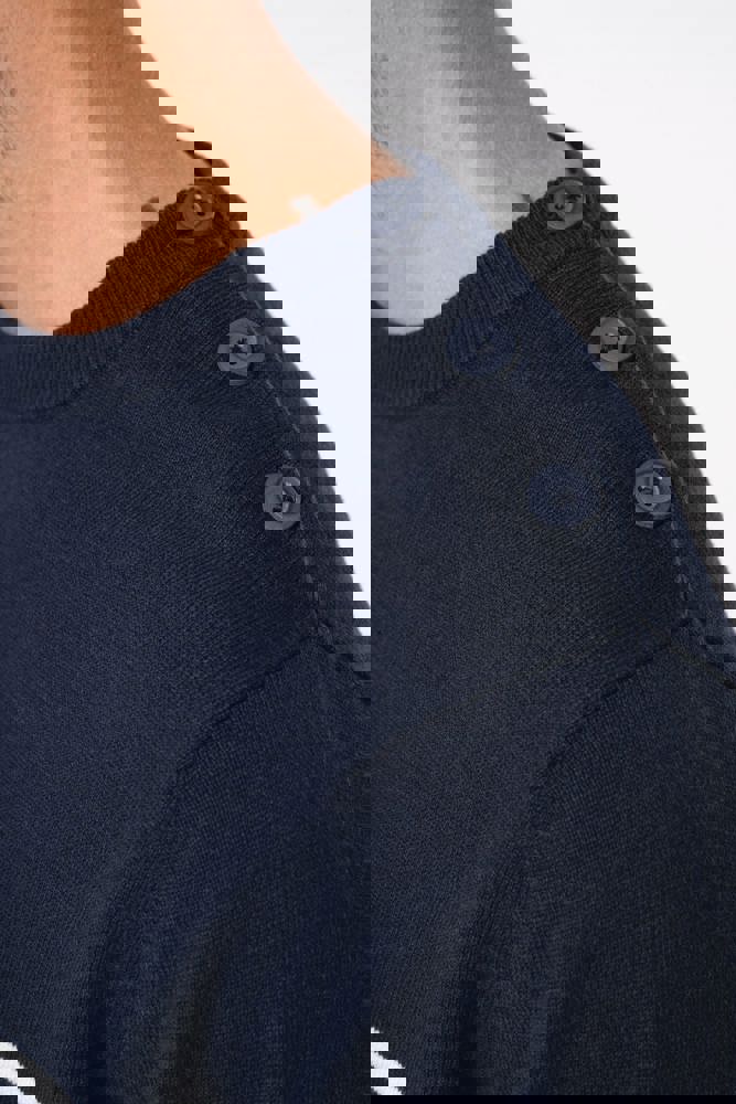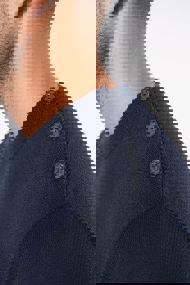 100% katoen. Gauge 12. Schouderopening links met 3 toon-op-toon knopen. 1x1 ribboord aan de halsopening. Gebreide mouwuiteinden en onderkant kledingstuk in dubbele dikte.