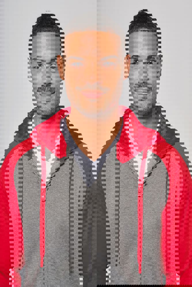 65% polyester / 35% katoen. Geborsteld fleece aan de binnenkant. Ritssluiting. Contrasterende raglanmouwen en capuchon. Capuchon gevoerd met toon op toon mesh. Kangoeroezakken met fluorescerend gsm-zakje. Opening voor headset-snoer. Mouwboorden en onderzijde in 2x2 ribboord met dubbele dikte.