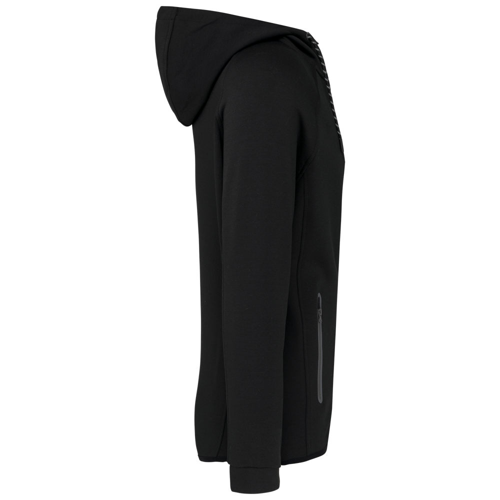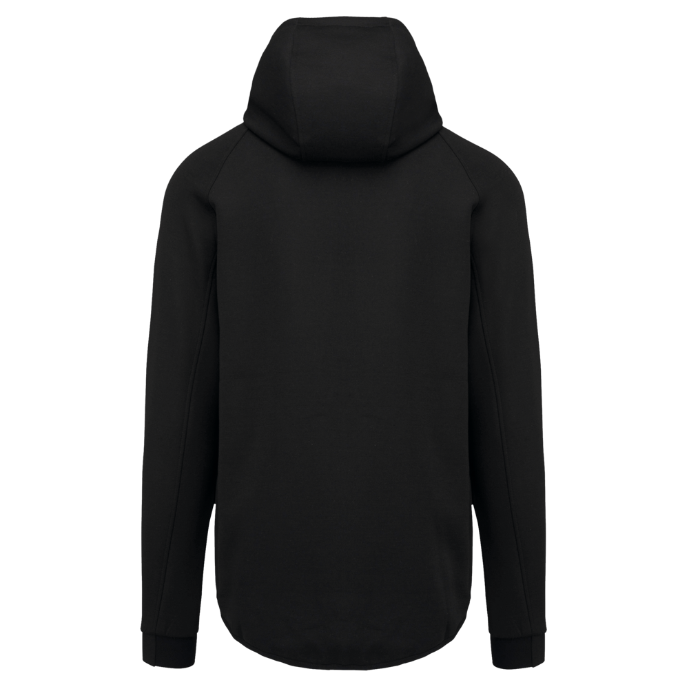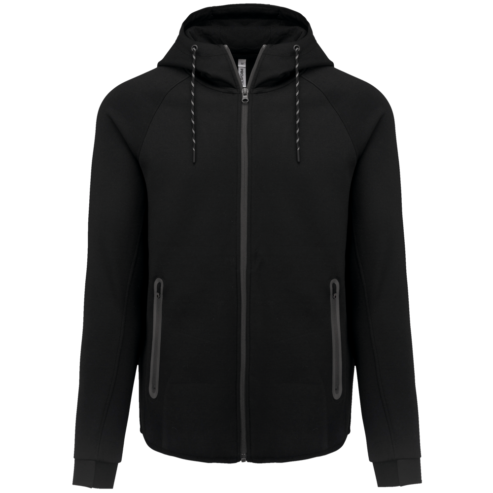 94% polyester / 6% elasthan. (Heather : 79% polyester / 15% viscose / 6% elasthan). Hele comfortabele stof. Ritssluiting. 2 ritszakken met warmtegelaste afwerking aan de voorkant. Capuchon met jerseyvoering van 65% polyester / 35% viscose met tweekleurige aanrijgkoordjes, afgewerkt met een plastic uiteinde. Nauwsluitende mouwuiteinden met een contrasterend, elastisch stuk. Onderkant kledingstuk afgewerkt met een contrasterende zoom. Black op alle kleuren en Dark Grey op de Ash Heather (sluitingen ook).