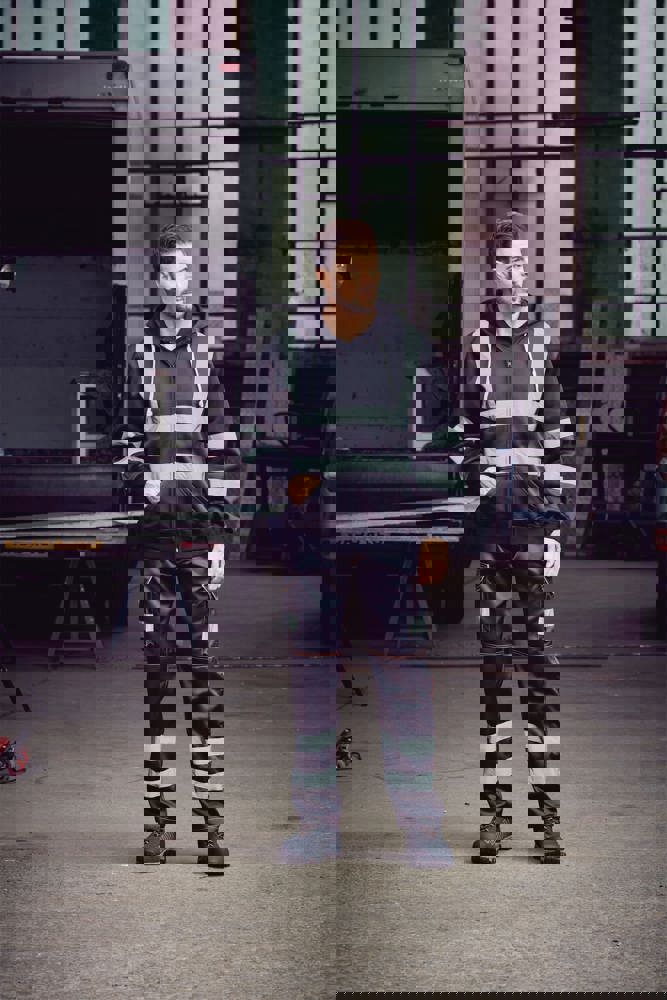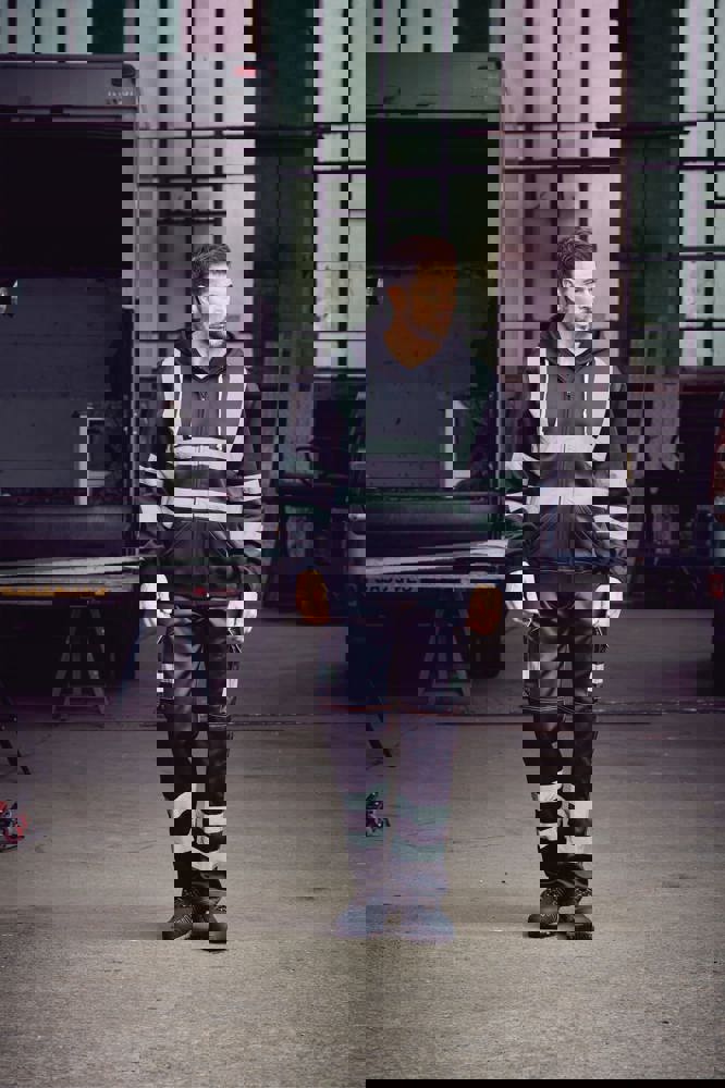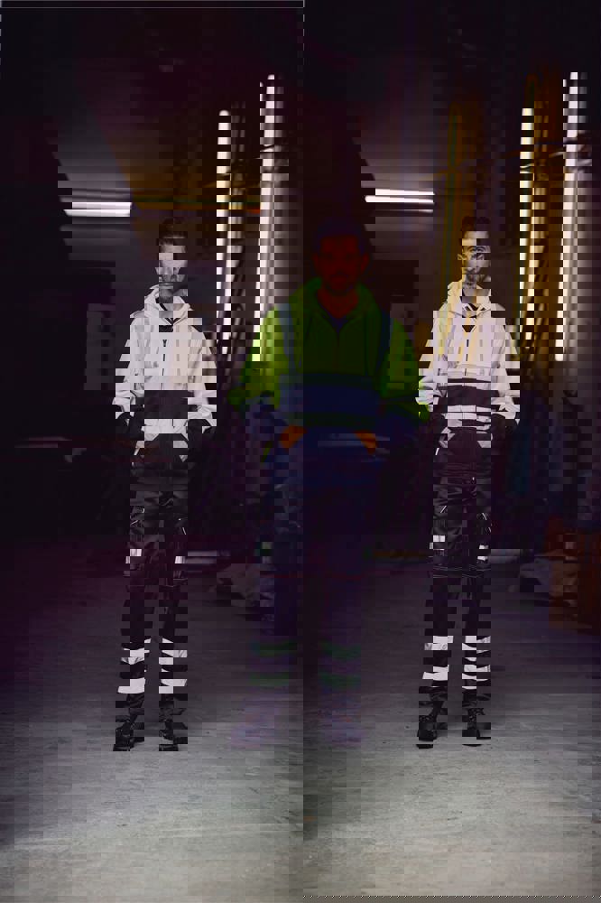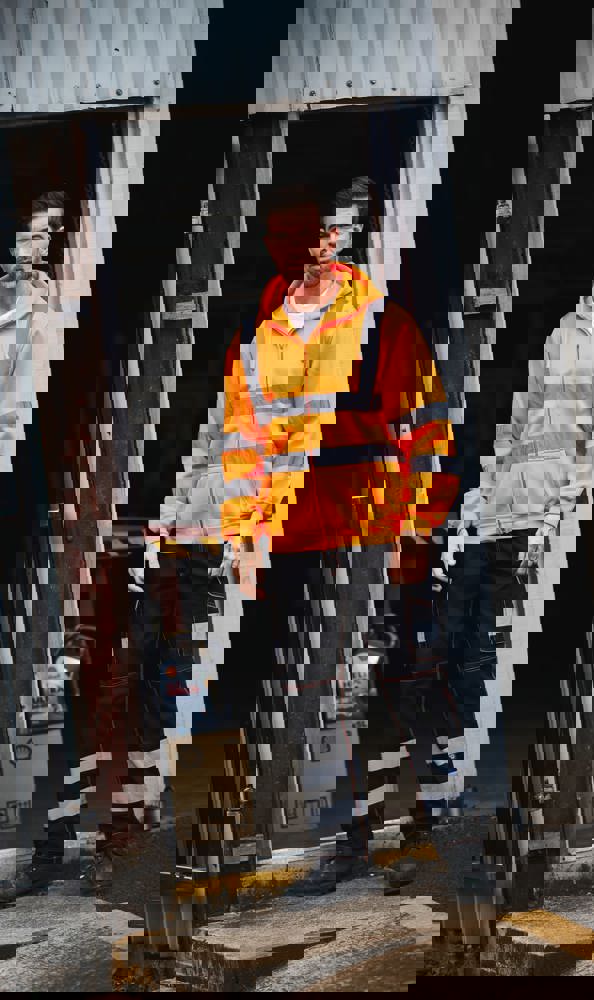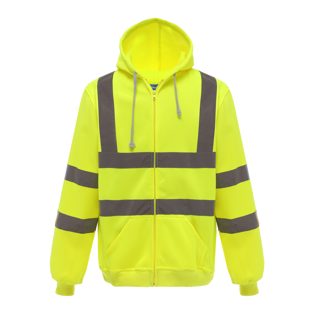 100% anti-pilling polyester. Twee 5 cm brede reflectiebanden rond het lichaam en armen, en één over elke schouder. Capuchon met trekkoord. Rits over de volledige lengte vooraan. Ribgebreide manchetten en tailleband. Afwerking met dubbele stiksels.Hi Vis Yellow enHi Vis Orange EN ISO20471 Class 3 conform.
