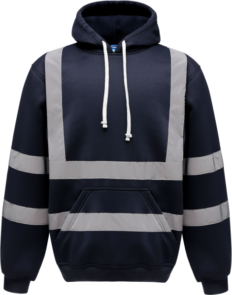 100% niet-pluizend polyester. 2 reflecterende stroken (5 cm breed) rond het lichaam en op de armen. Een reflecterende band op iedere schouder. Nektape. Capuchon (in het verlengde van de kraag) met aanrijgkoordje. Ingezette mouwen. Kangoeroezak aan de voorkant. Uiteinden van mouwen en kledingstuk in ribboord. Dubbel stiksel aan kraag, uiteinden van mouwen en kledingstuk. Norm EN ISO 20471 van klasse 3 : Hi-Vis Yellow, Hi-Vis Orange, Hi-Vis yellow/Navy, Hi-Vis Orange/Navy.