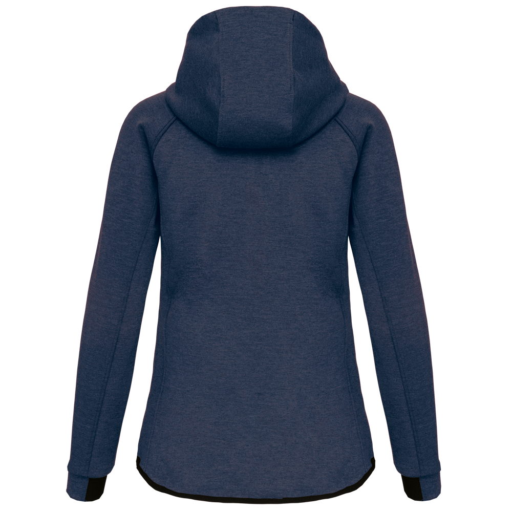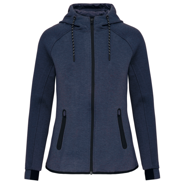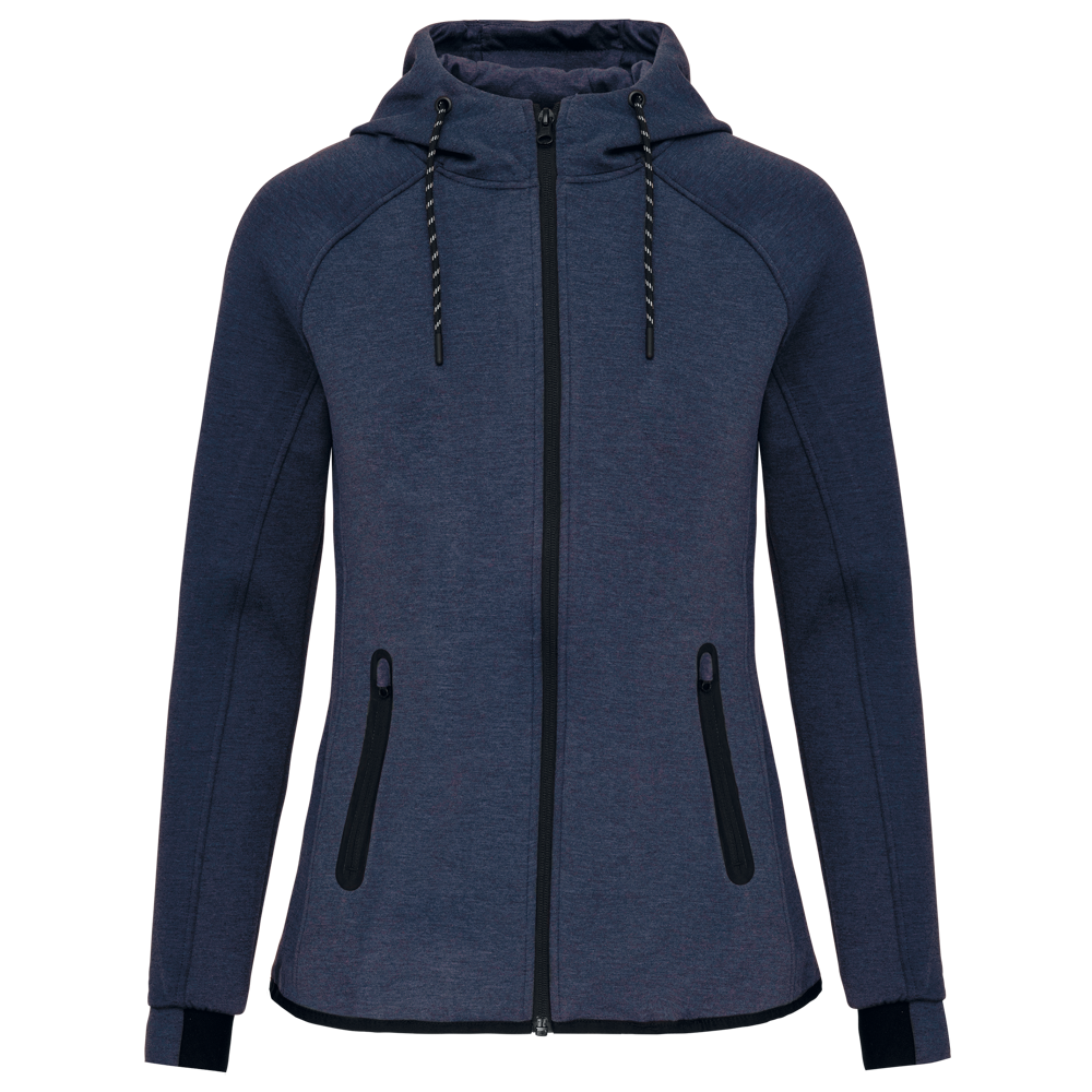 94% polyester / 6% elasthan. (Heather : 79% polyester / 15% viscose / 6% elasthan). Slim fit. Hele comfortabele stof. Ritssluiting. 2 ritszakken met warmtegelaste afwerking aan de voorkant. Capuchon met jerseyvoering van 65% polyester / 35% viscose met tweekleurige aanrijgkoordjes, afgewerkt met een plastic uiteinde. Nauwsluitende mouwuiteinden met een contrasterend, elastisch stuk. Onderkant kledingstuk afgewerkt met een contrasterende biaisband. Black op alle kleuren en Dark Grey op de Ash Heather (sluitingen ook).